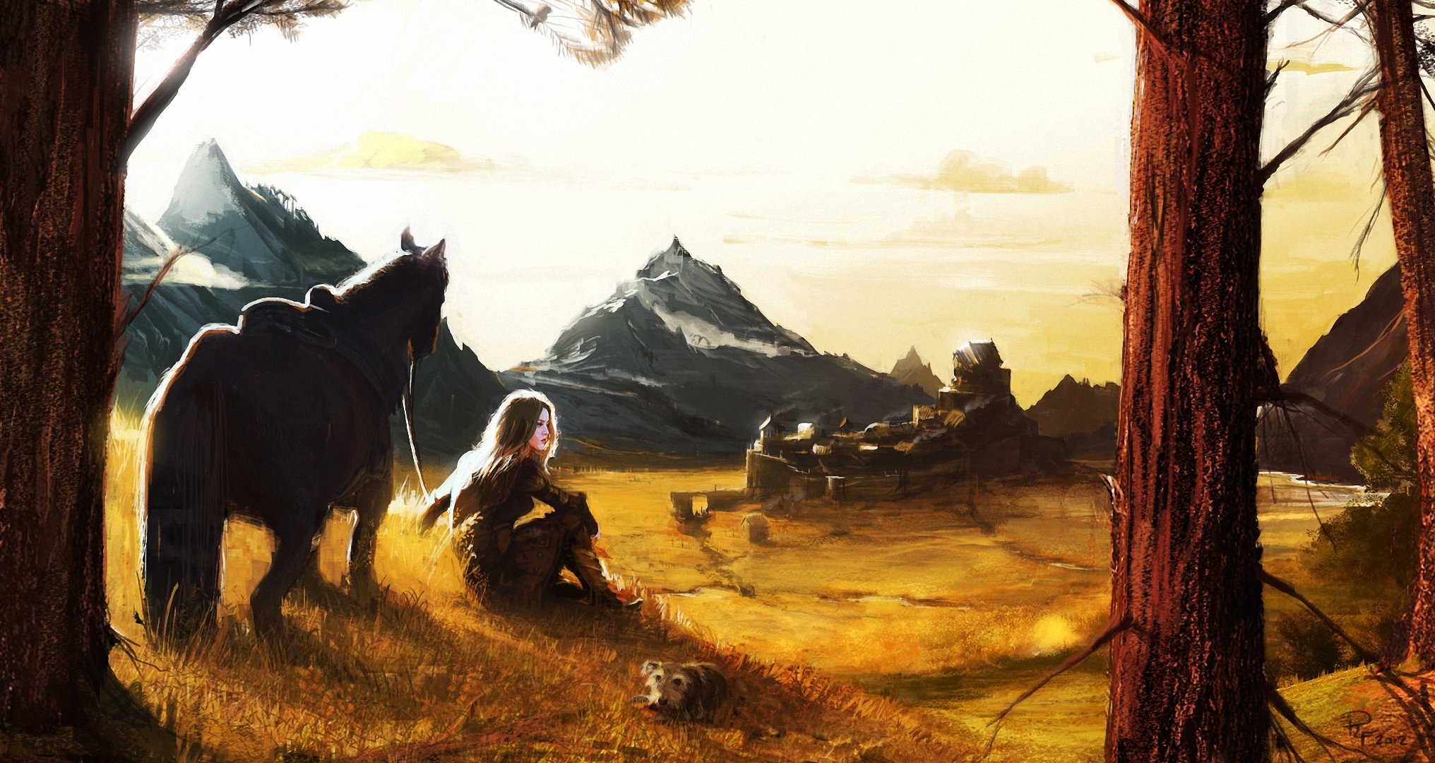 Tags:art, girl, horse, mountain, settlement, town, tree