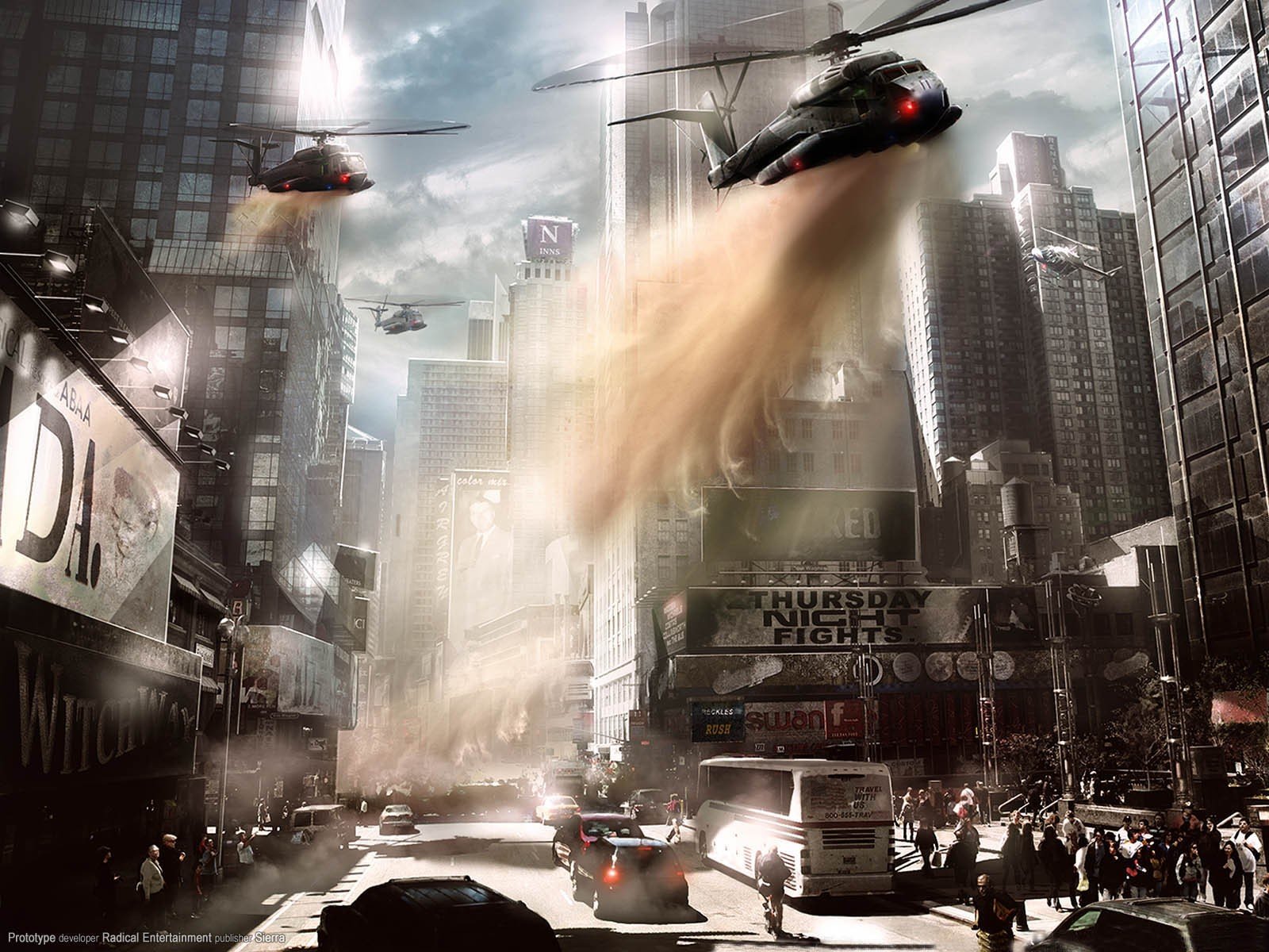 Helicopters in the city near skyscrapers - desktop wallpapers