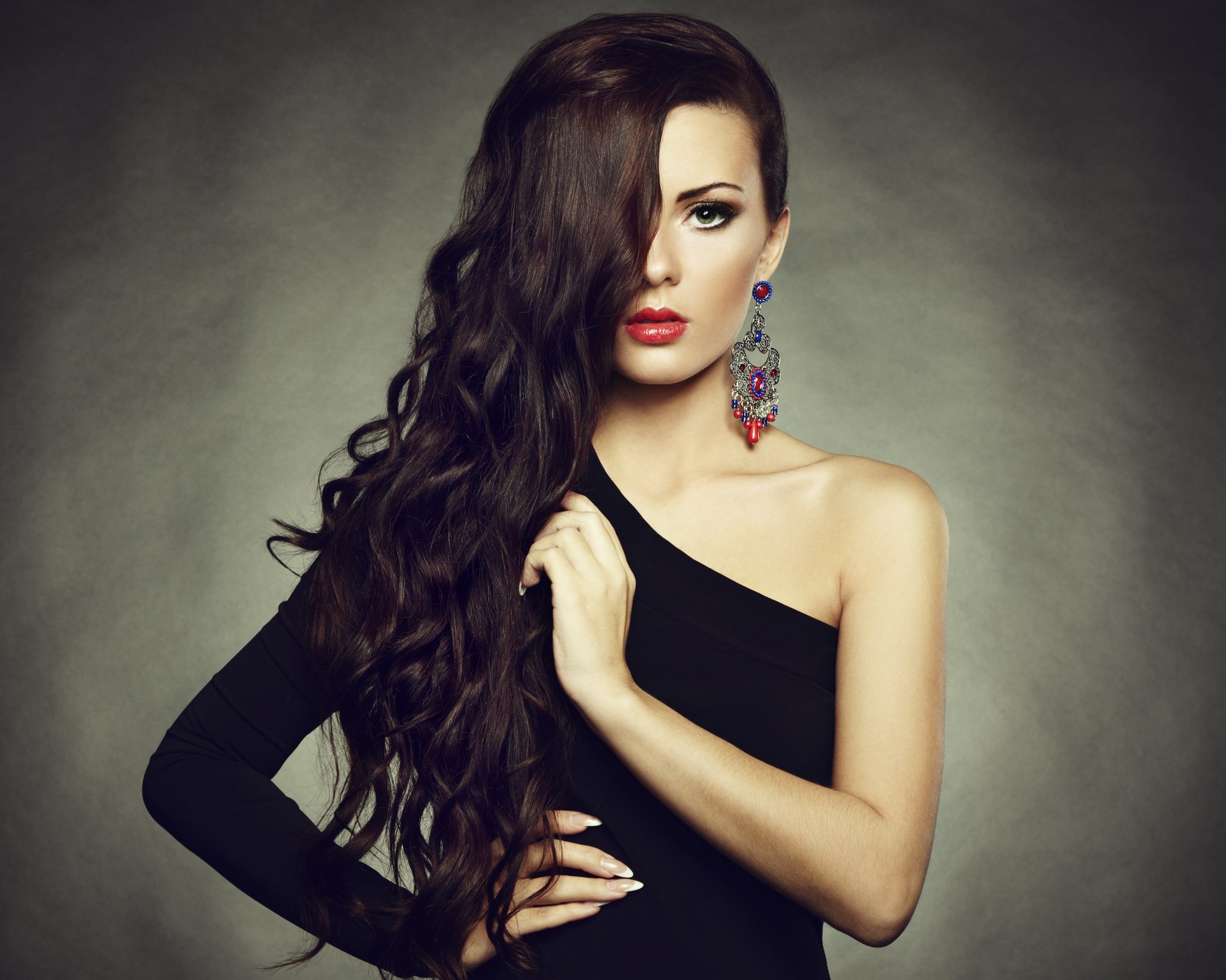 Tags:girl, make-up, lipstick, red lips, view, hair, earrings, shoulder, black dress, background