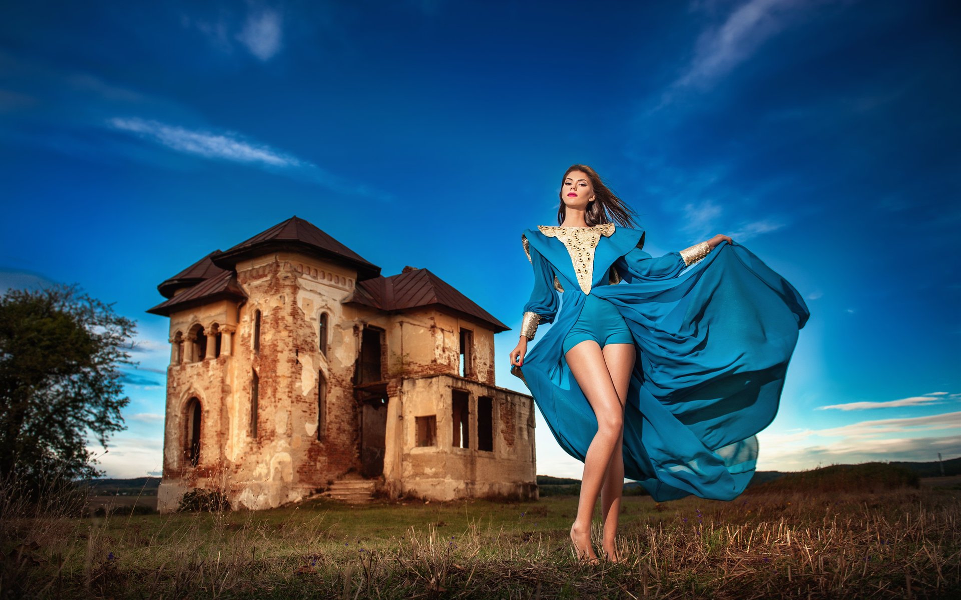 Tags:nature, house, girl, model, figure, pose, dress, make-up, view