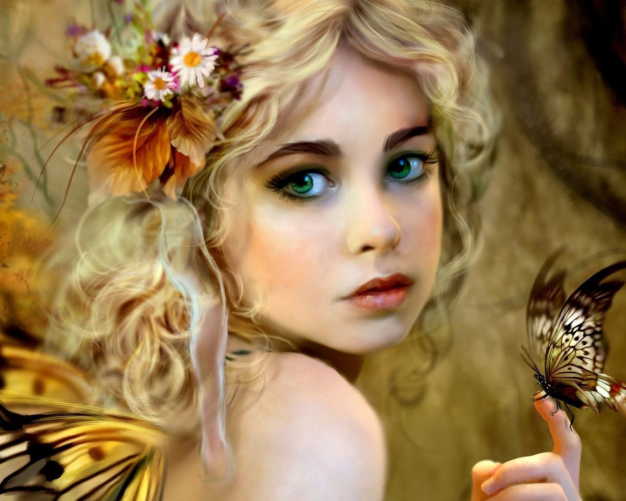 Fairy holds a butterfly on her finger - wallpapers for your phone