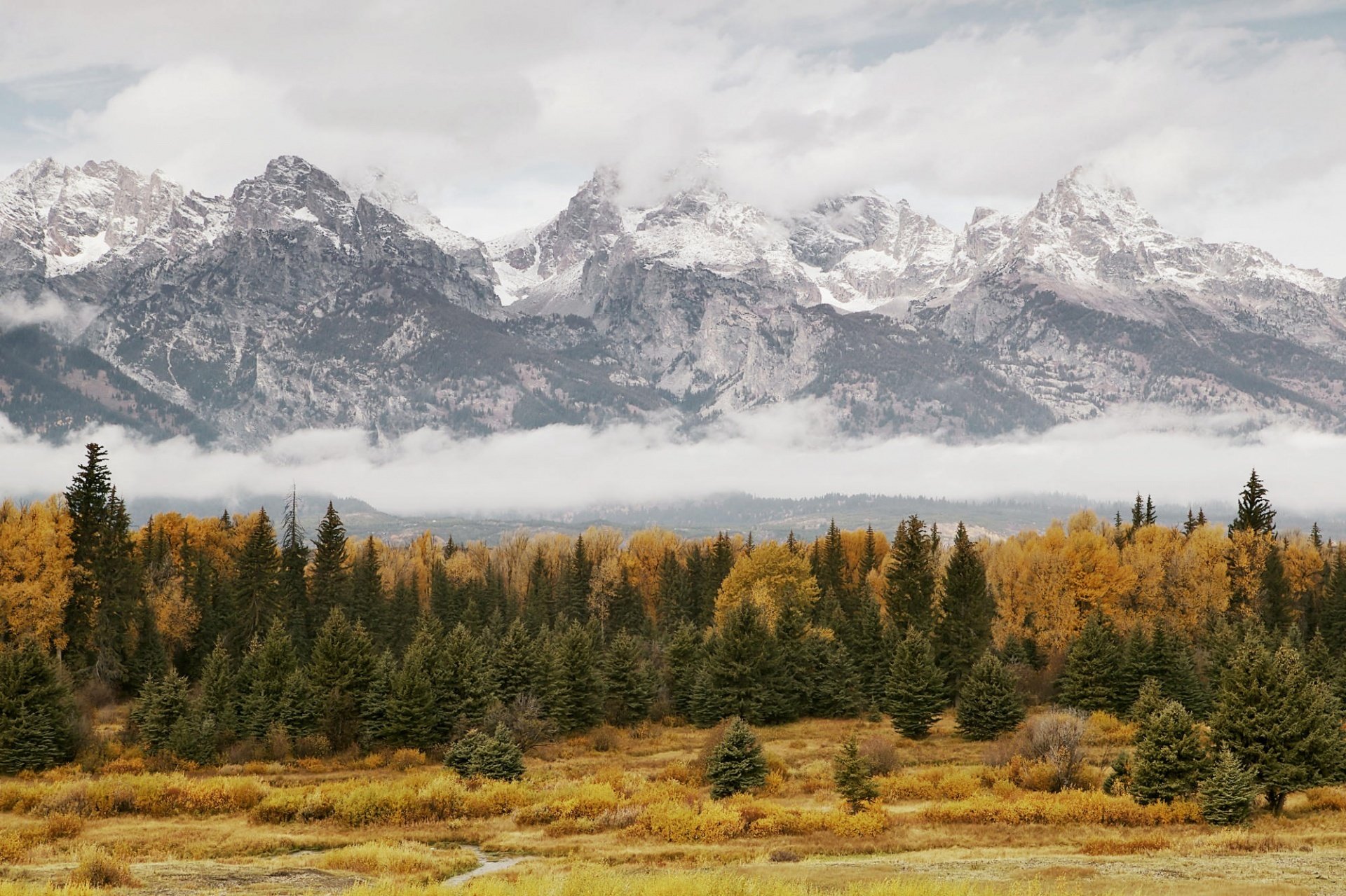 mountain grey sky clouds fog forest tree autumn