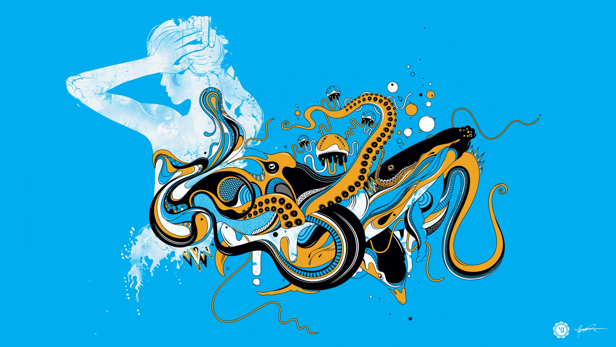 On a blue background, a white girl and a yellow octopus