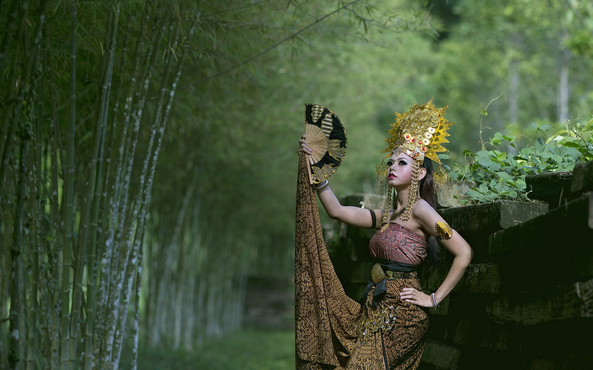 Beautiful girl with a fan on a background of green trees