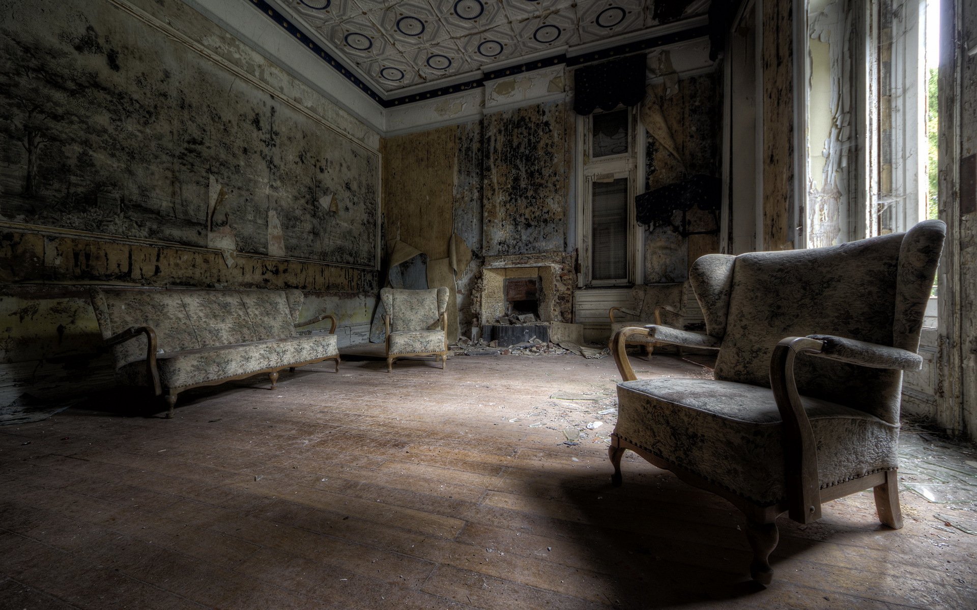 An open coffin lined with red silk fabric standing on the floor of an old abandoned room