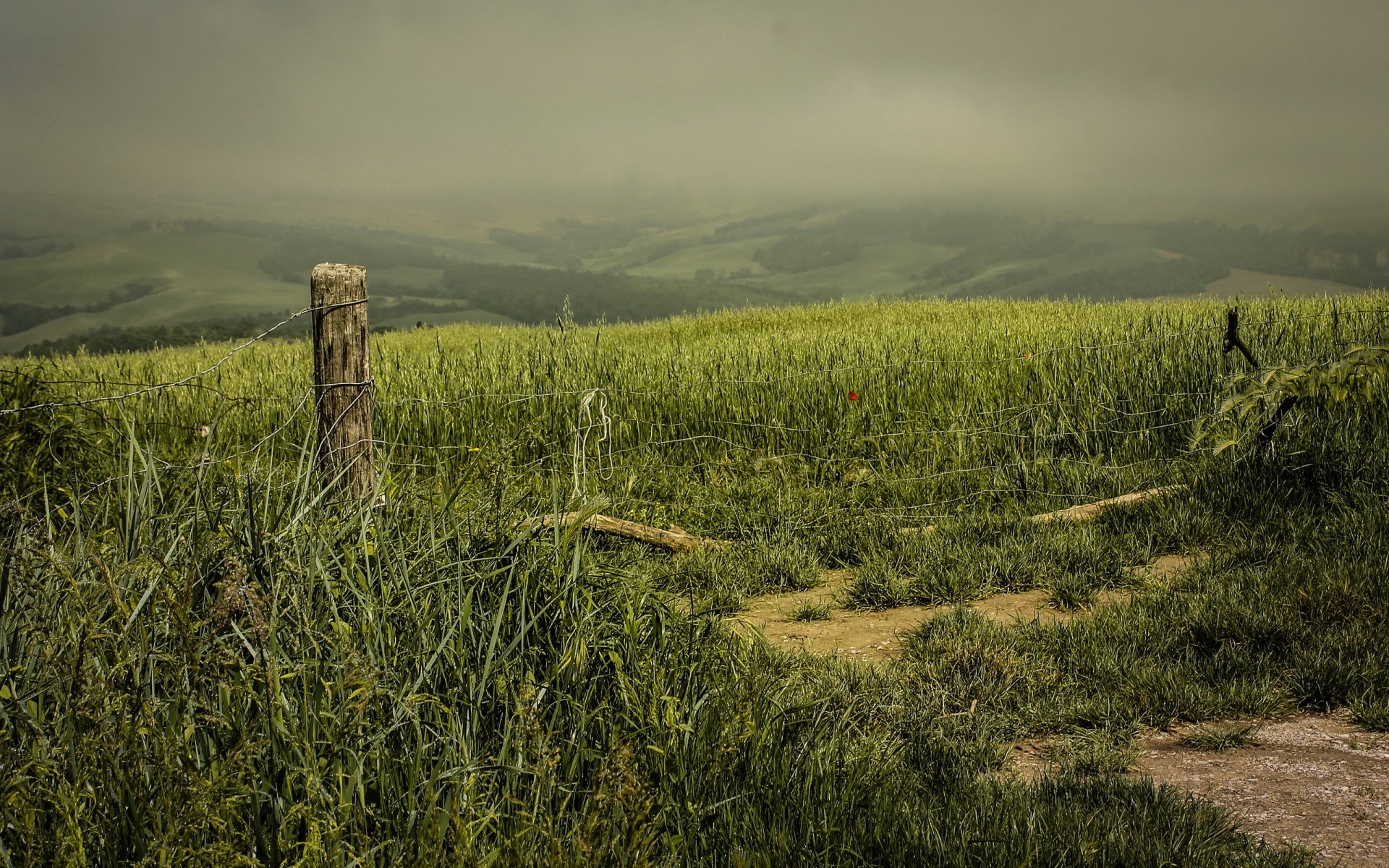 Foggy after with barbed wire