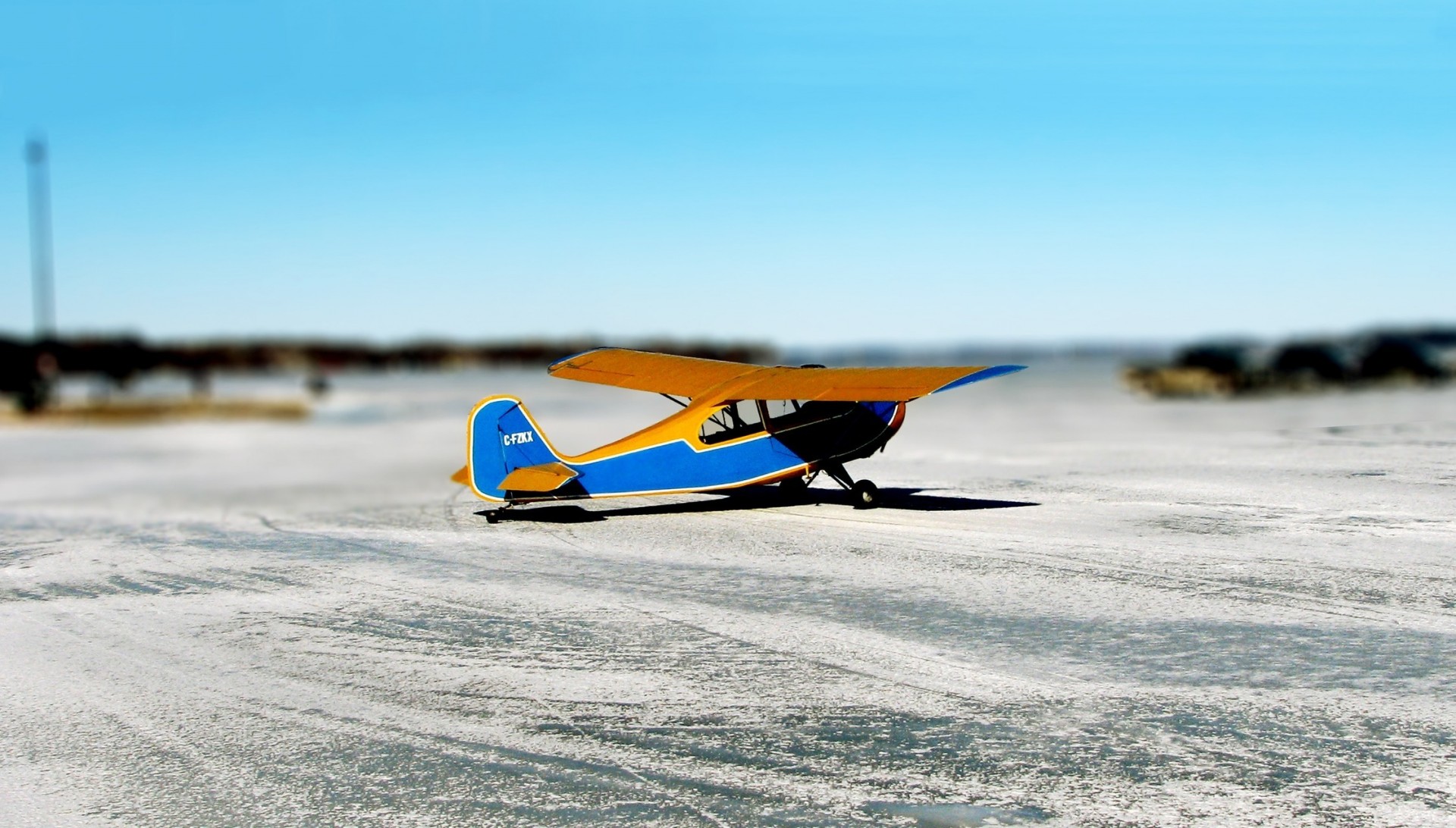 Blue and yellow airplane on the runway