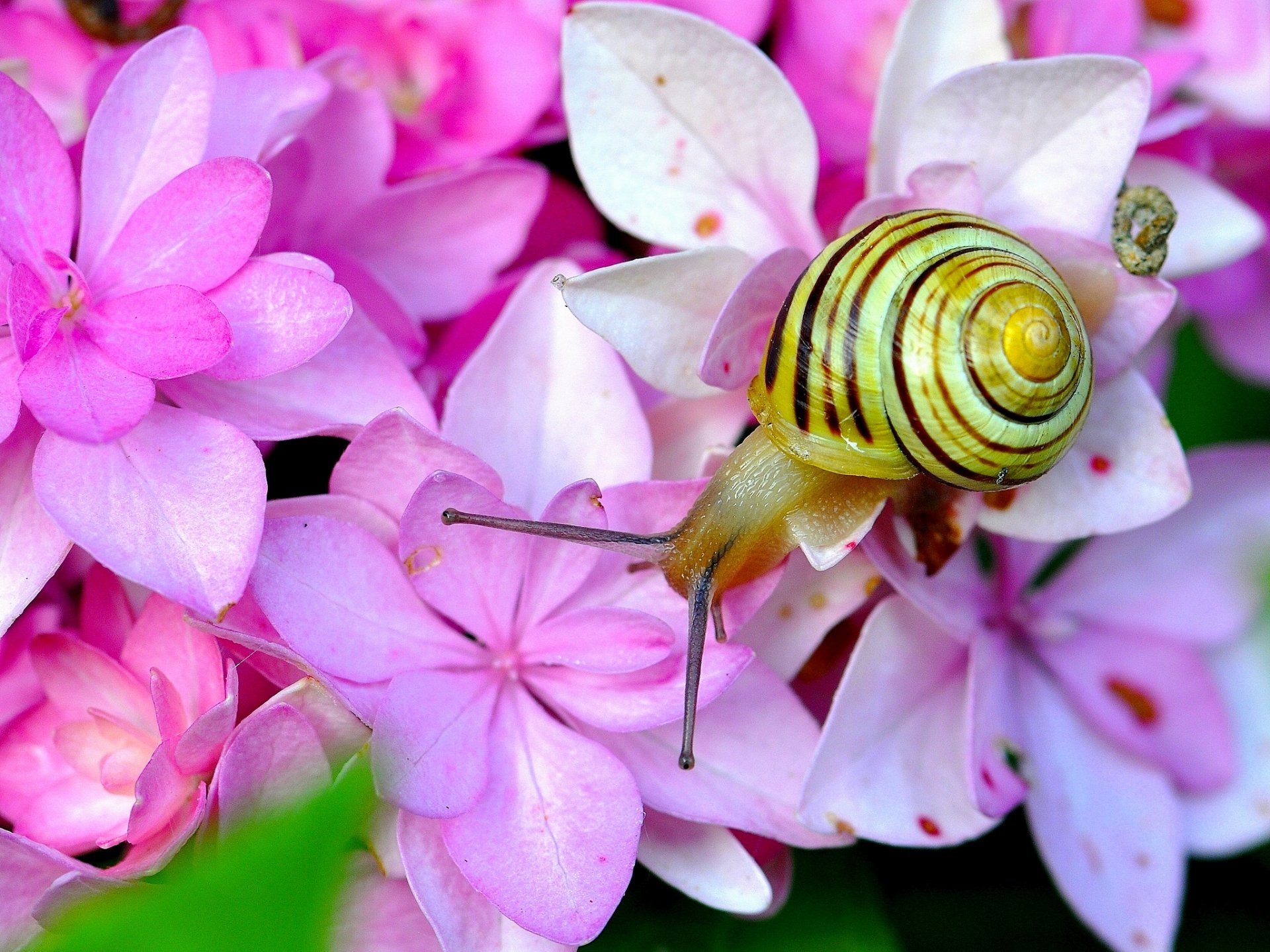 The snail pulled out the horns on the hydrangea flower gardenThe snail pulled out the horns on the hydrangea flower garden