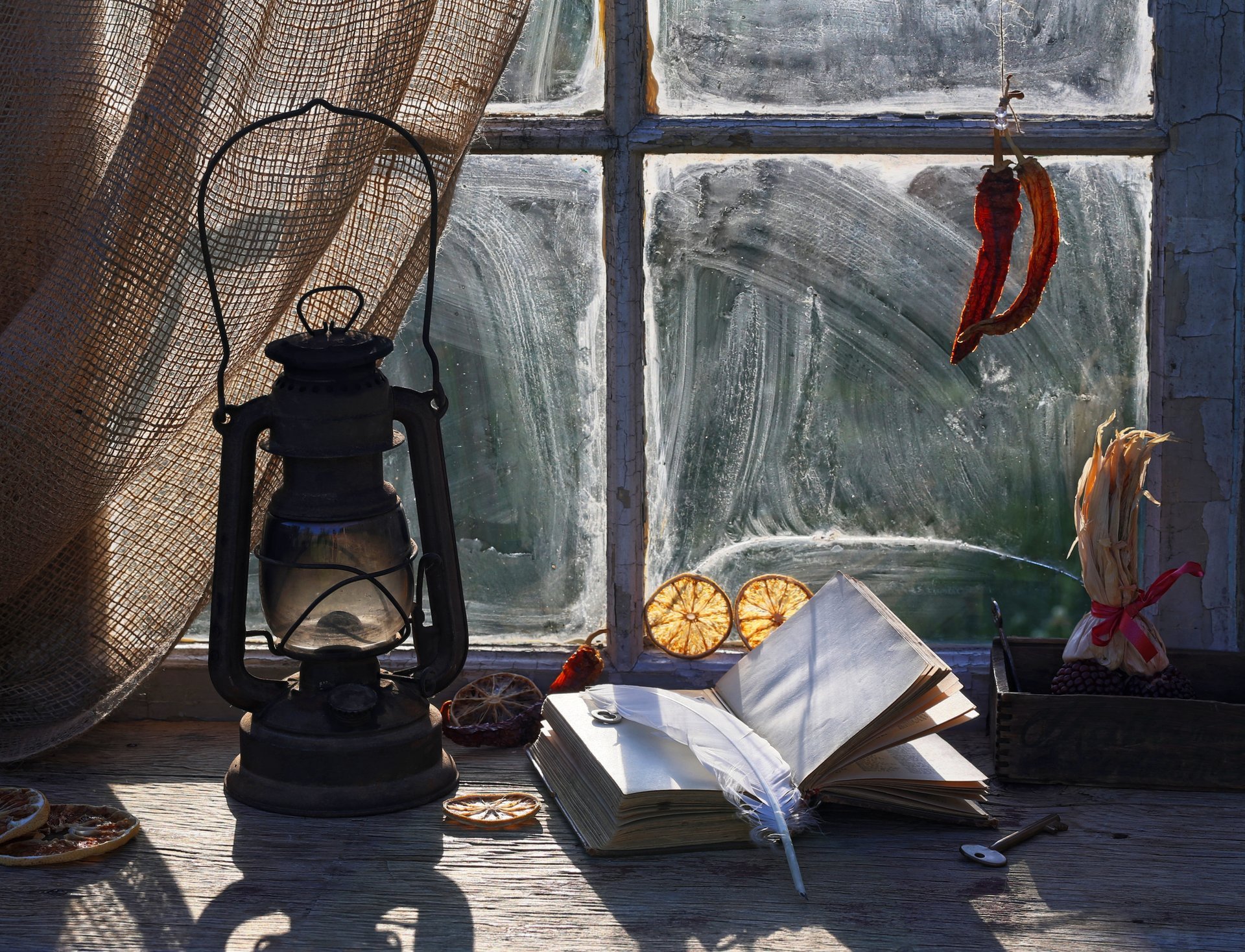 A book with a pen and a kerosene lamp on the windowsillA book with a pen and a kerosene lamp on the windowsill