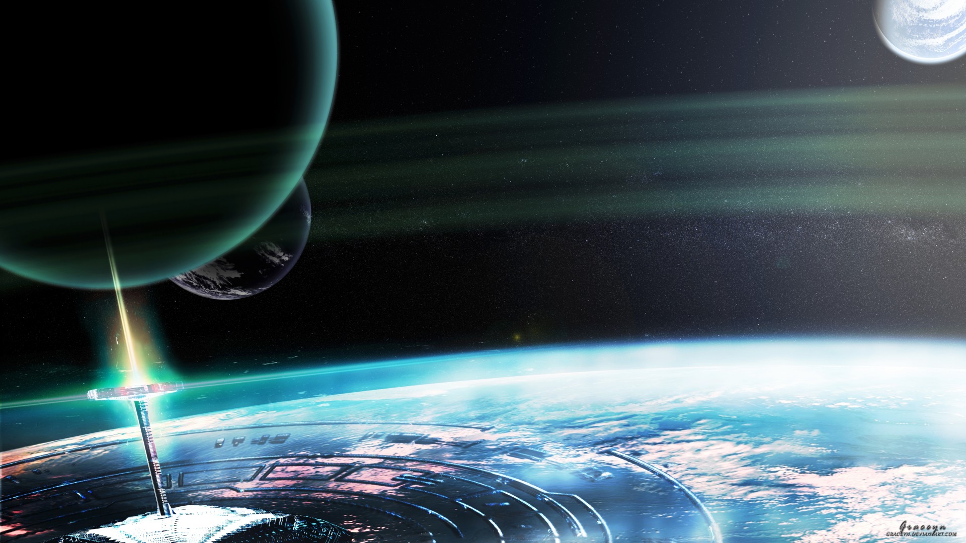 View from one planet to the bright sun and another planetView from one planet to the bright Sun and another planet