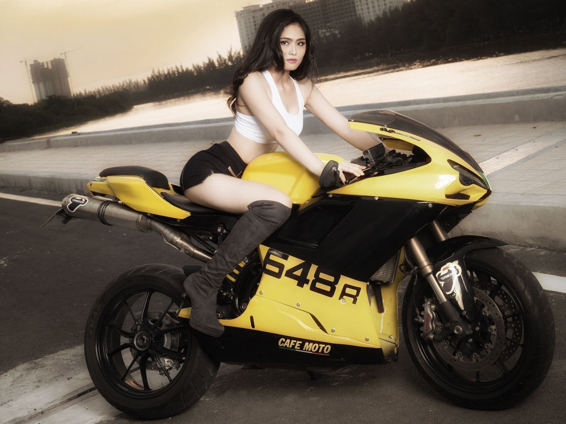 Asian woman with loose hair sitting on a motorcycleAsian woman with loose hair sitting on a motorcycle