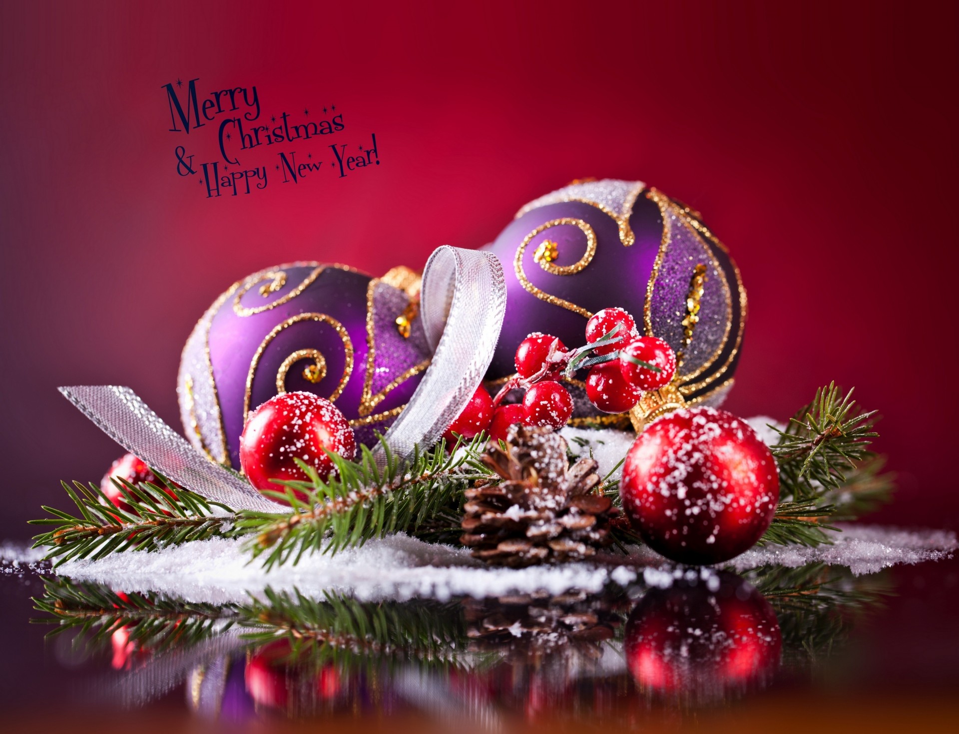 Purple Christmas balls on a red background
