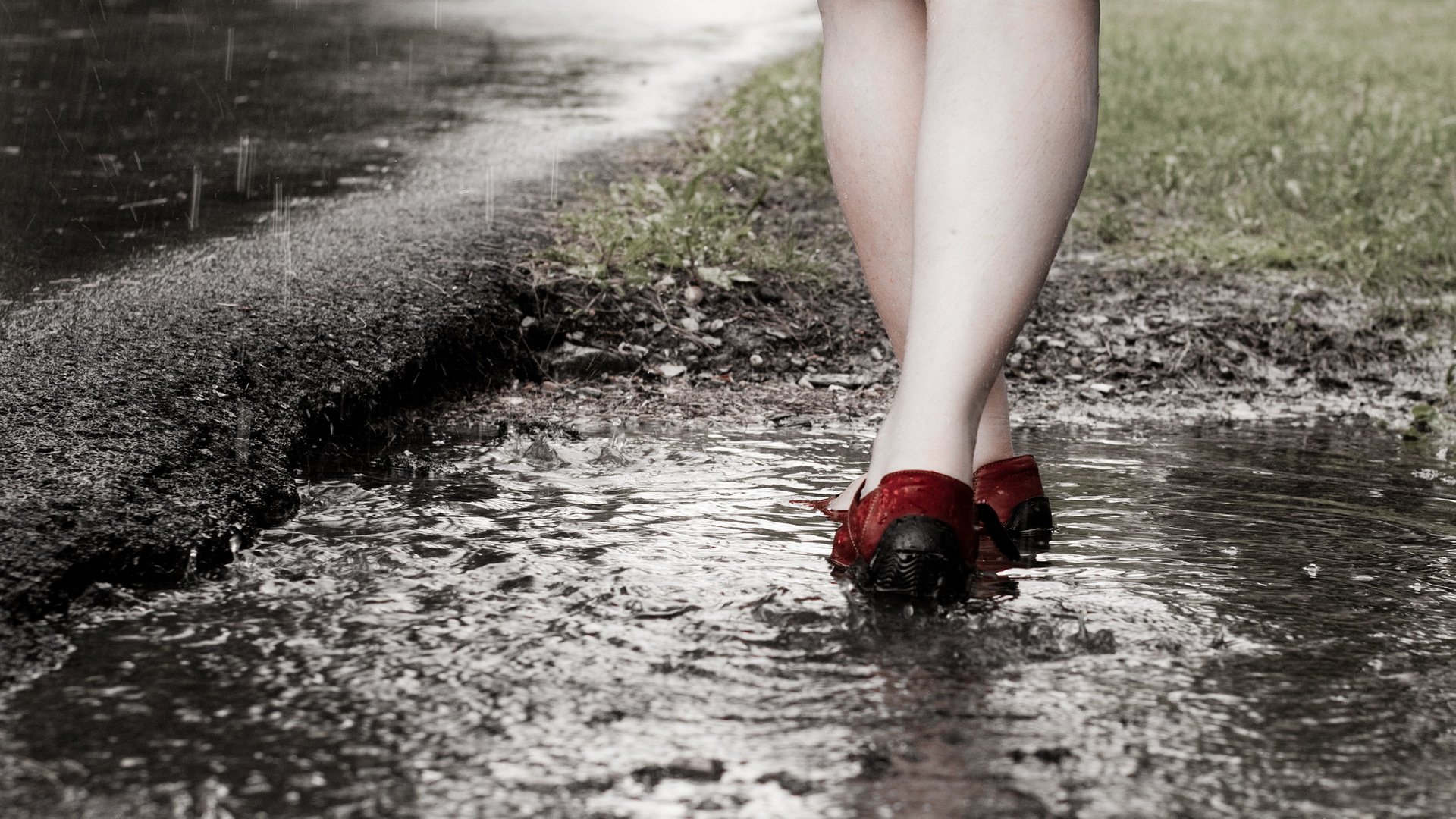 Feet in red shoes in a puddle