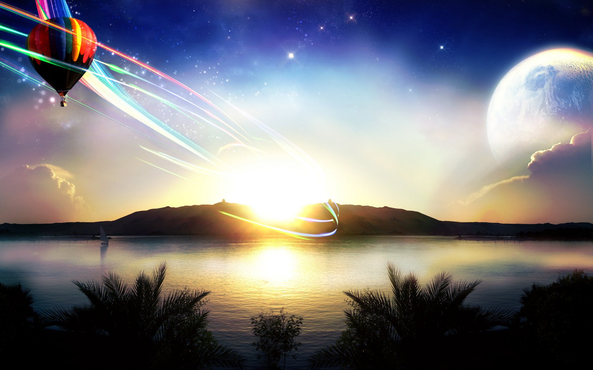 Balloon over the sea in the rays of the sunset treeBalloon over the sea in the rays of the sunset tree