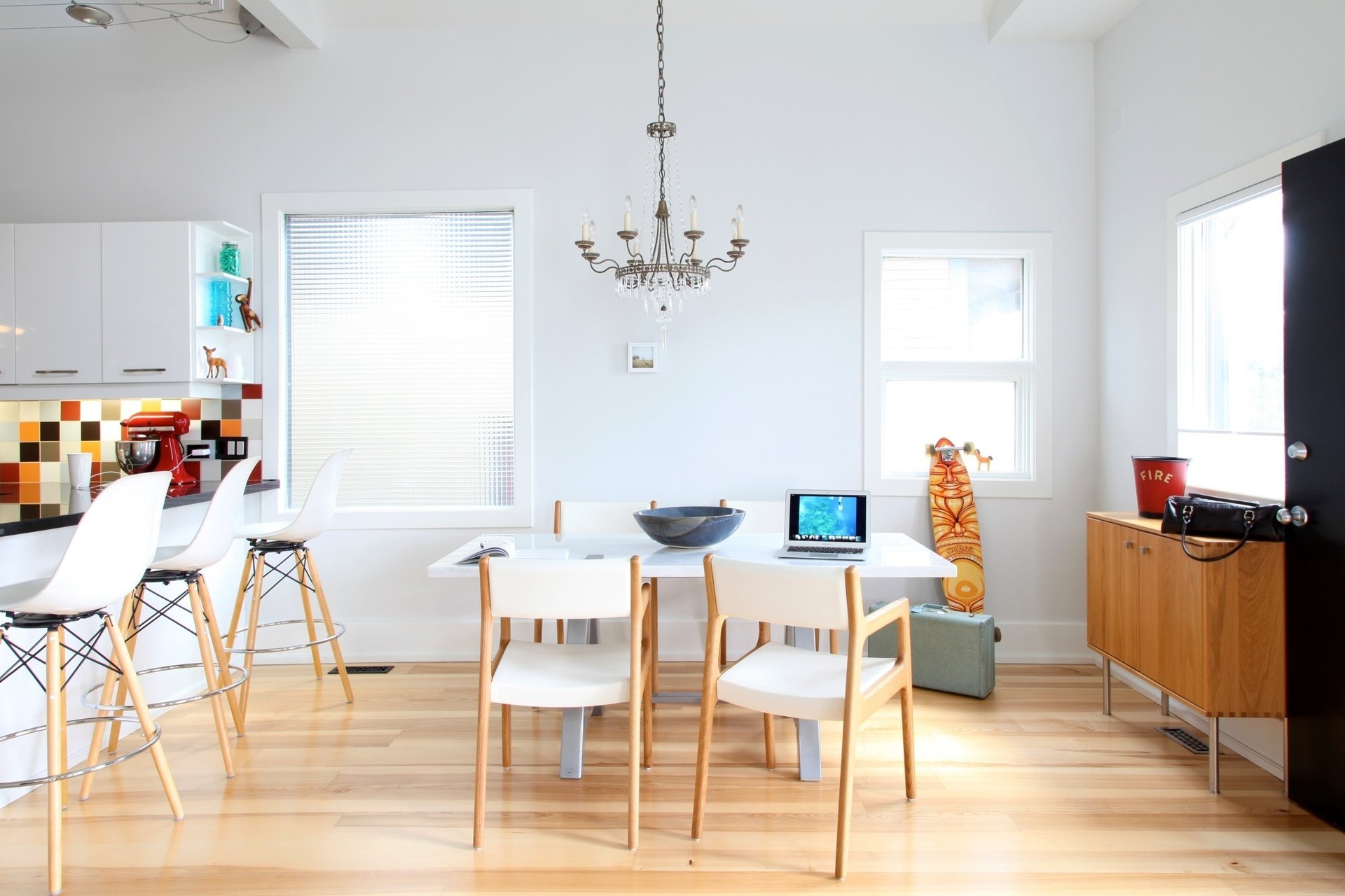 Snow-white kitchen with chandelier and chairs