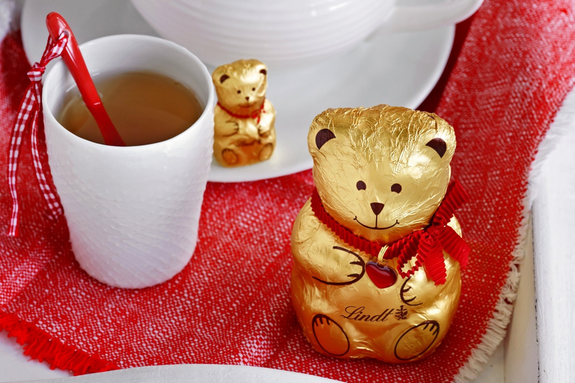 Chocolate bears with a mug of tea in a cozy atmosphereChocolate bears with a mug of tea in a cozy atmosphere