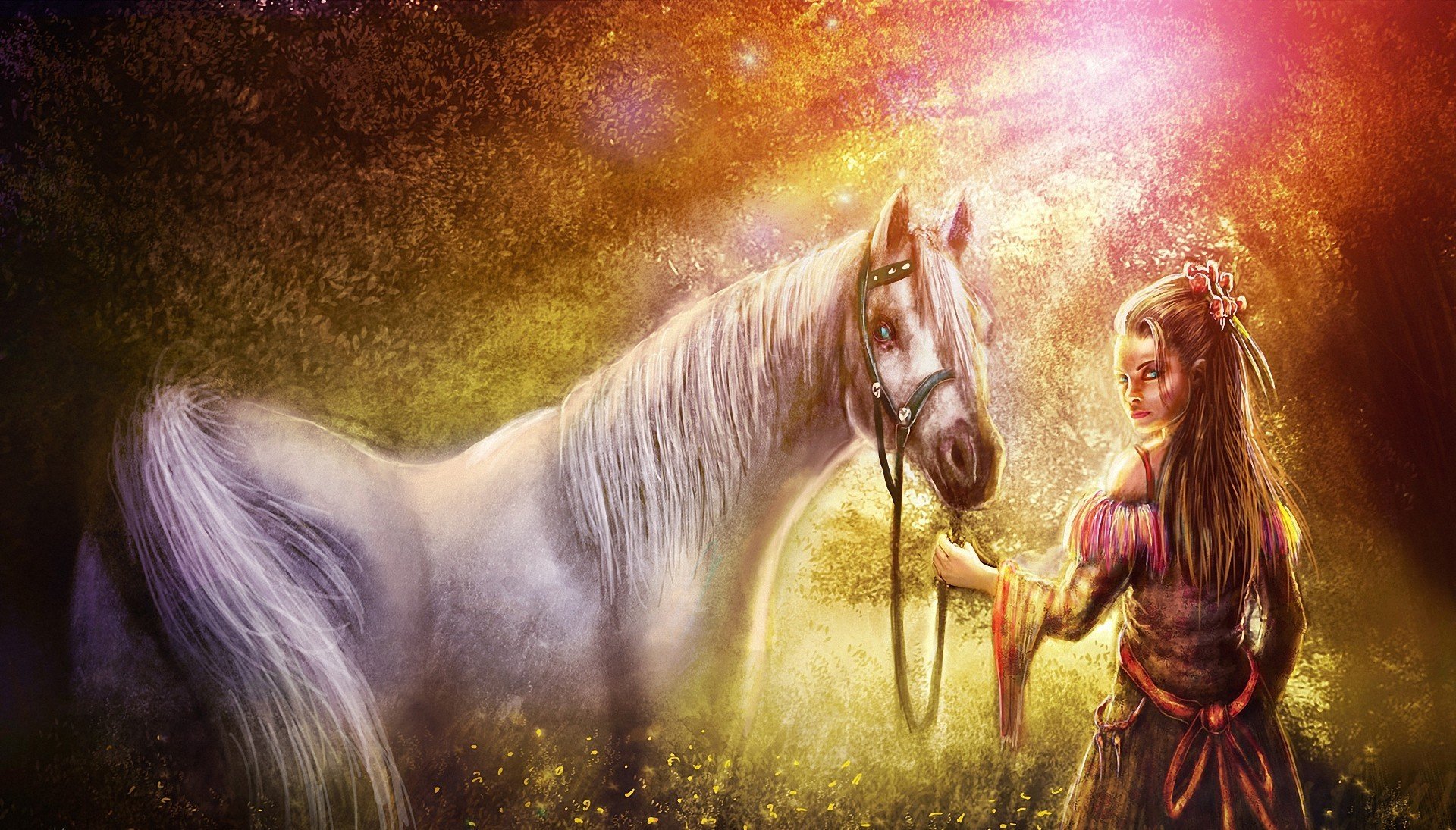 A beautiful girl with a horse in a fabulous forestA beautiful girl with a horse in a fabulous forest
