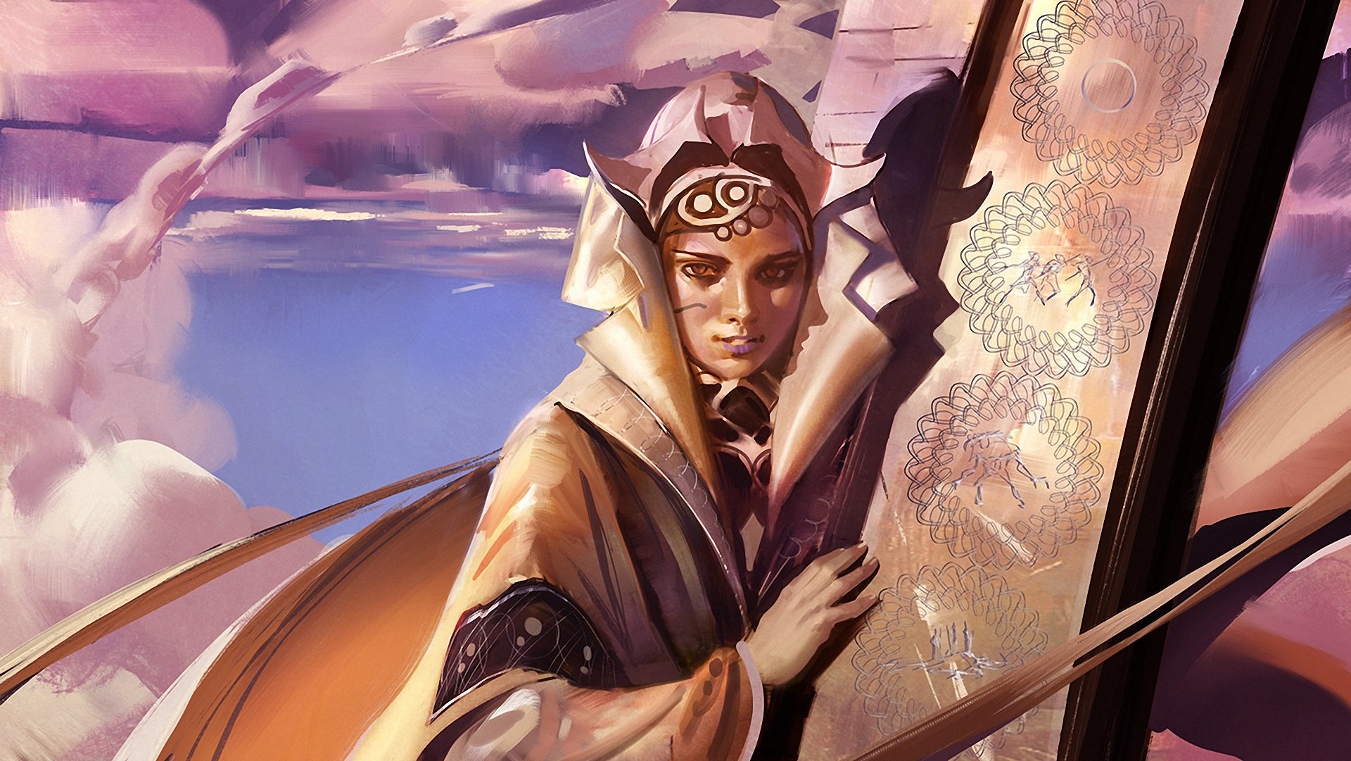 A girl on a pink sky background and columns with patterns