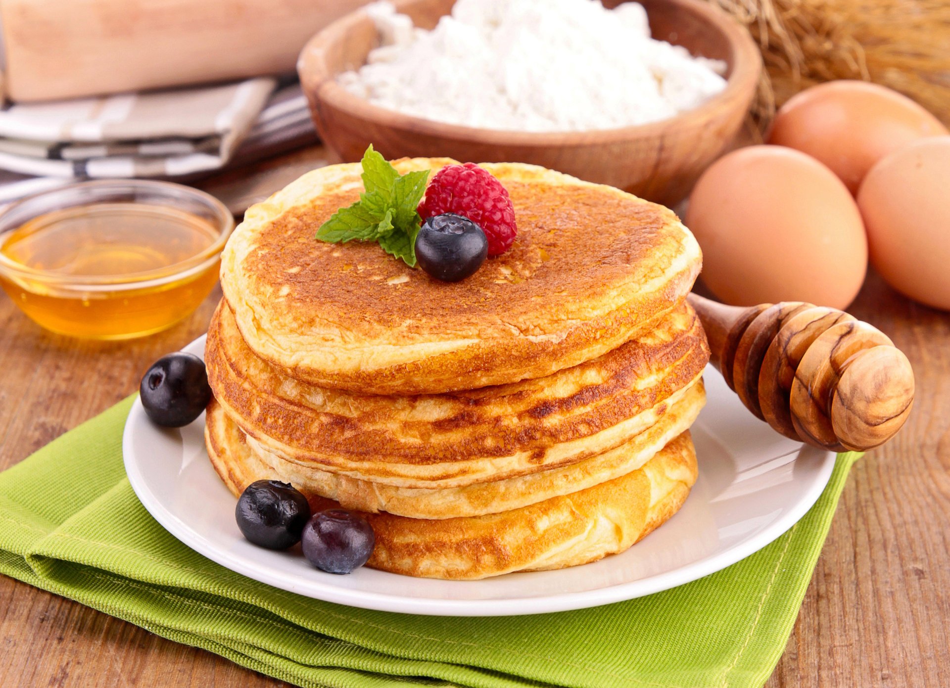 Pancakes with berries and cottage cheese , on the tablePancakes with berries and cottage cheese , on the table