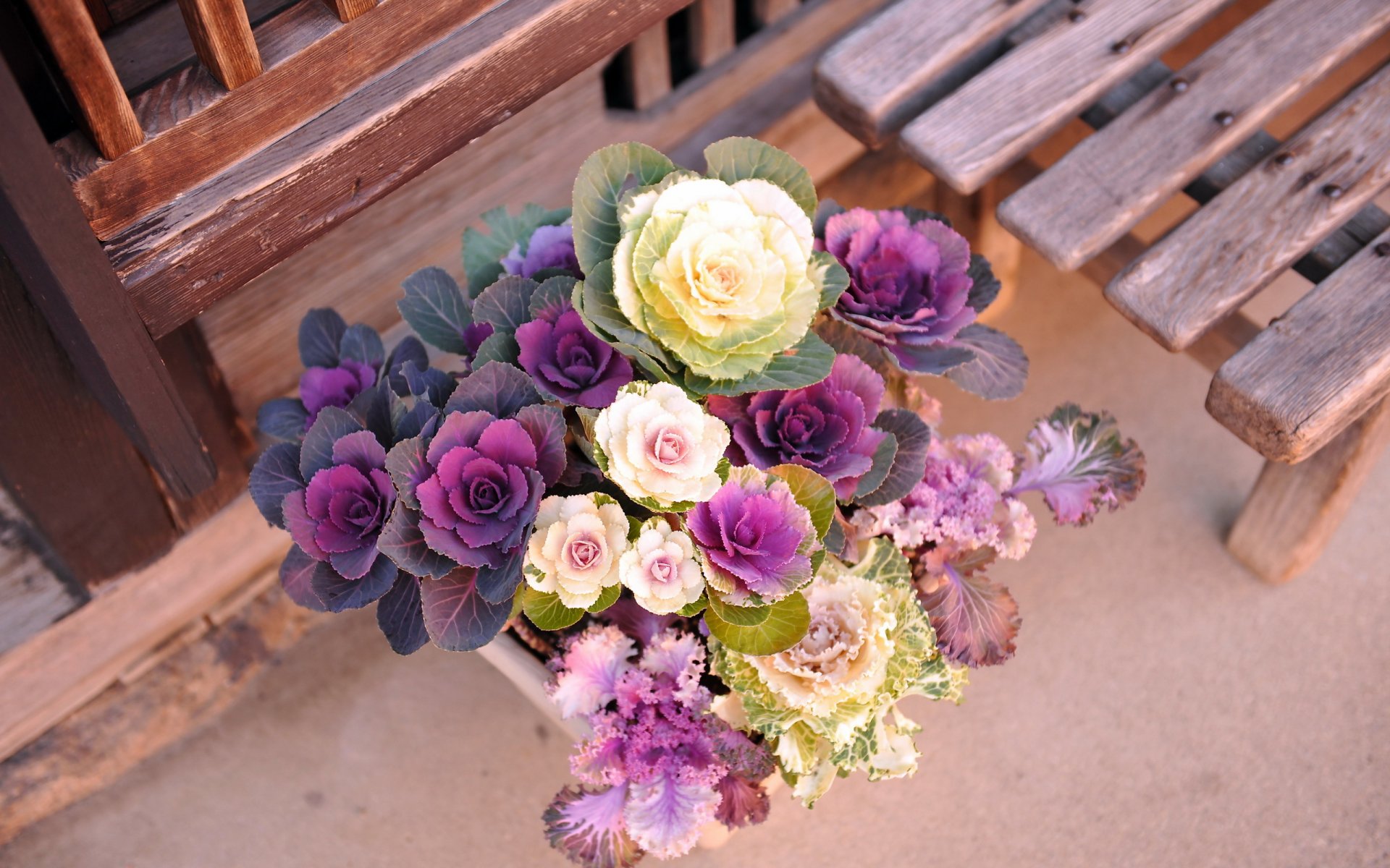 A cup with a bouquet of flowers on a children's swingA cup with a bouquet of flowers on a children's swing