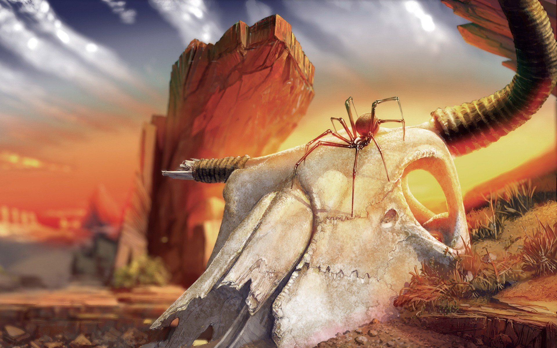 A spider on a buffalo's skull in the sand