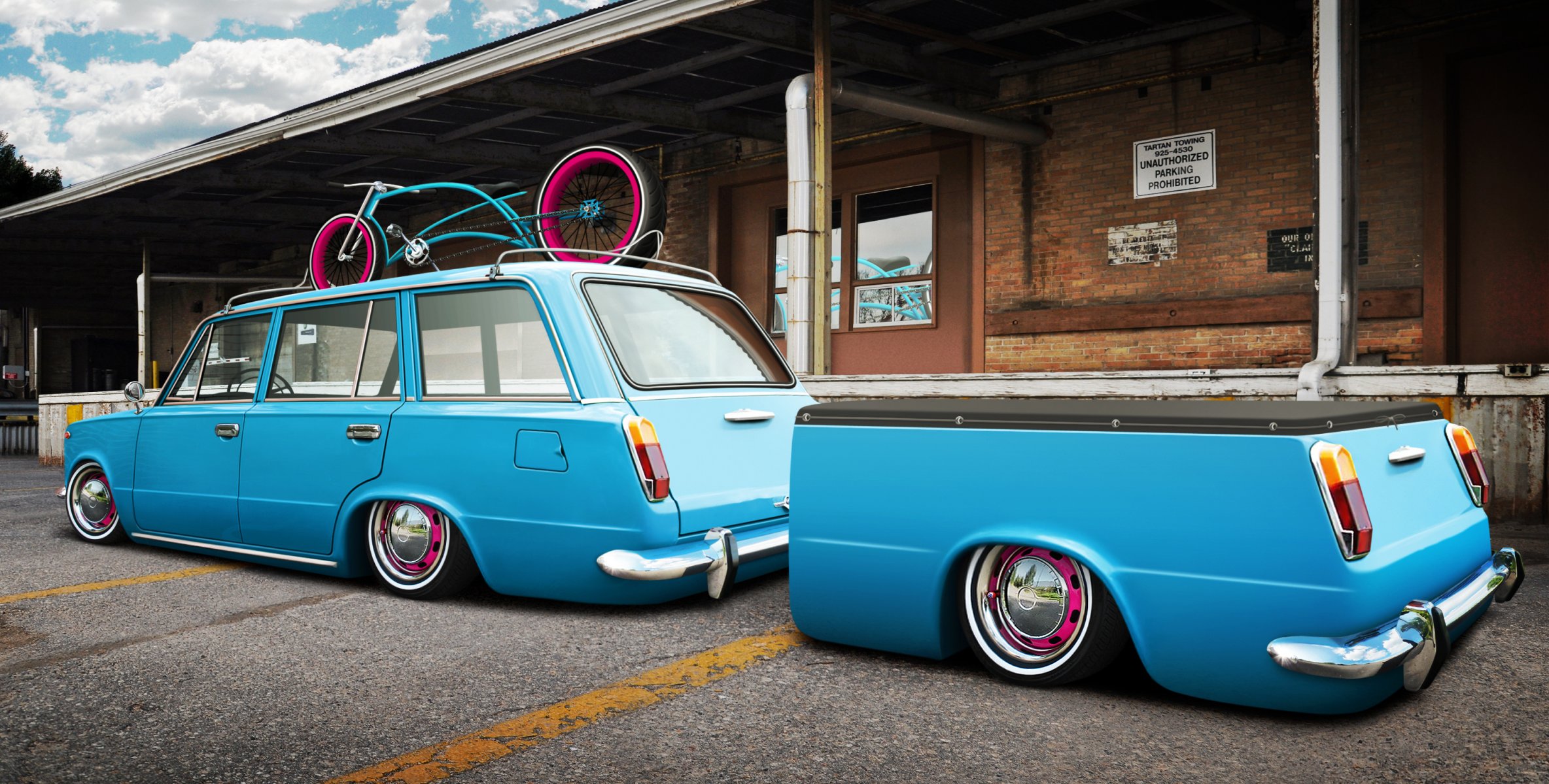 A car with a trailer. The car is blue