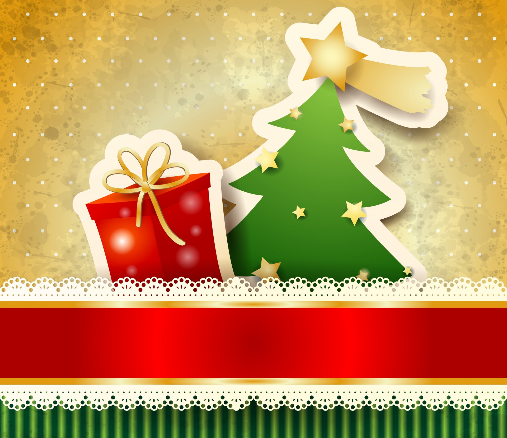 A painted Christmas tree and a gift box with a bow