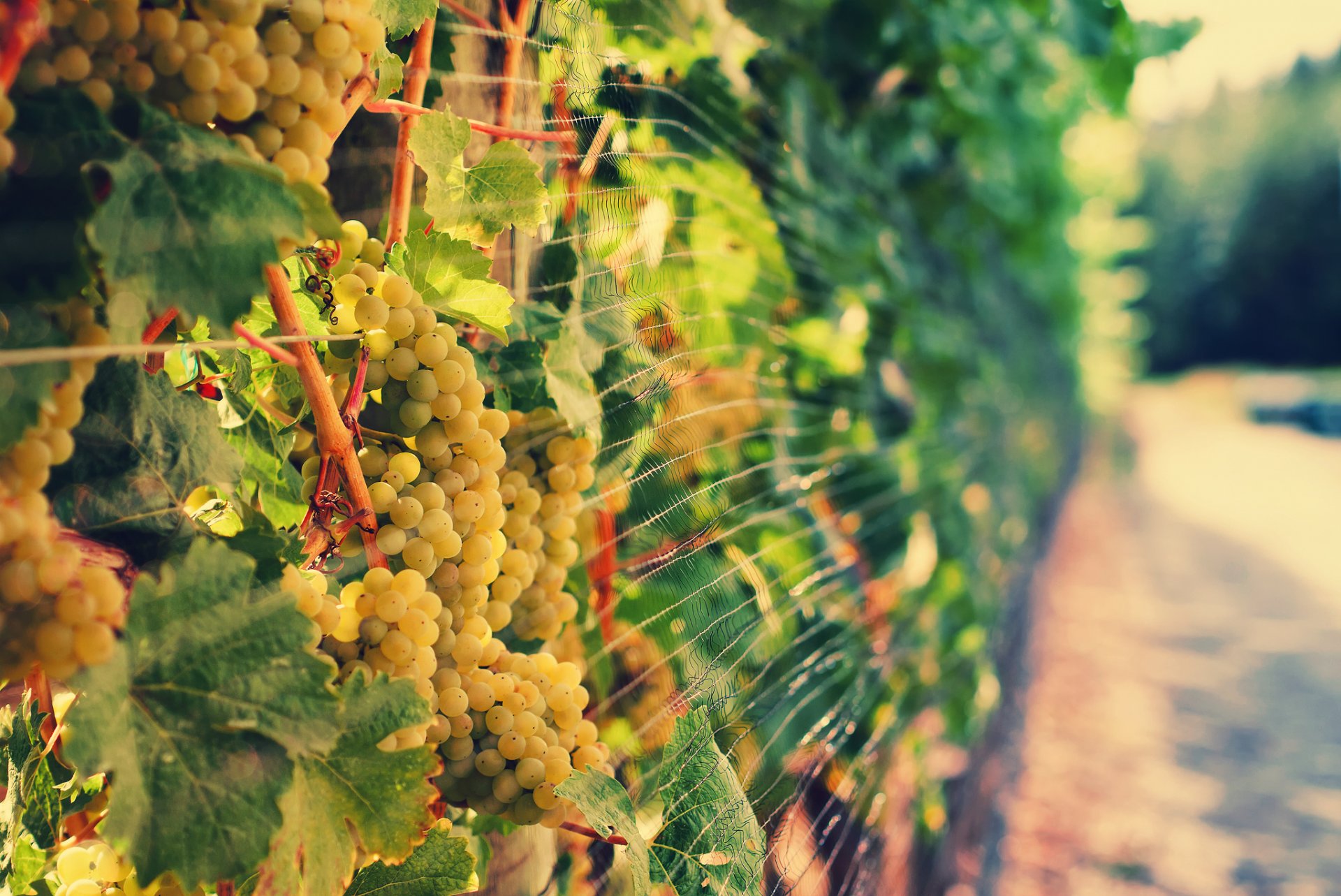 Against the background of a vineyard, a barrel and wine in glasses, next to a bunch of grapesAgainst the background of a vineyard, a barrel and wine in glasses, next to a bunch of grapes