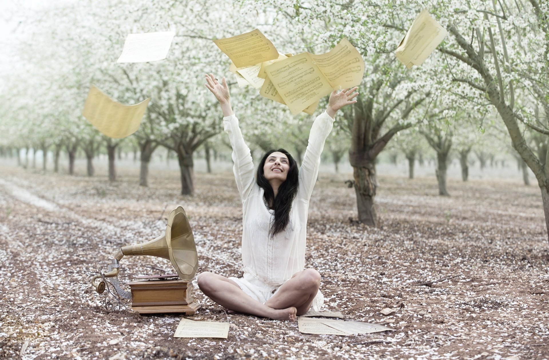 A girl throws notes next to a gramophone in the garden