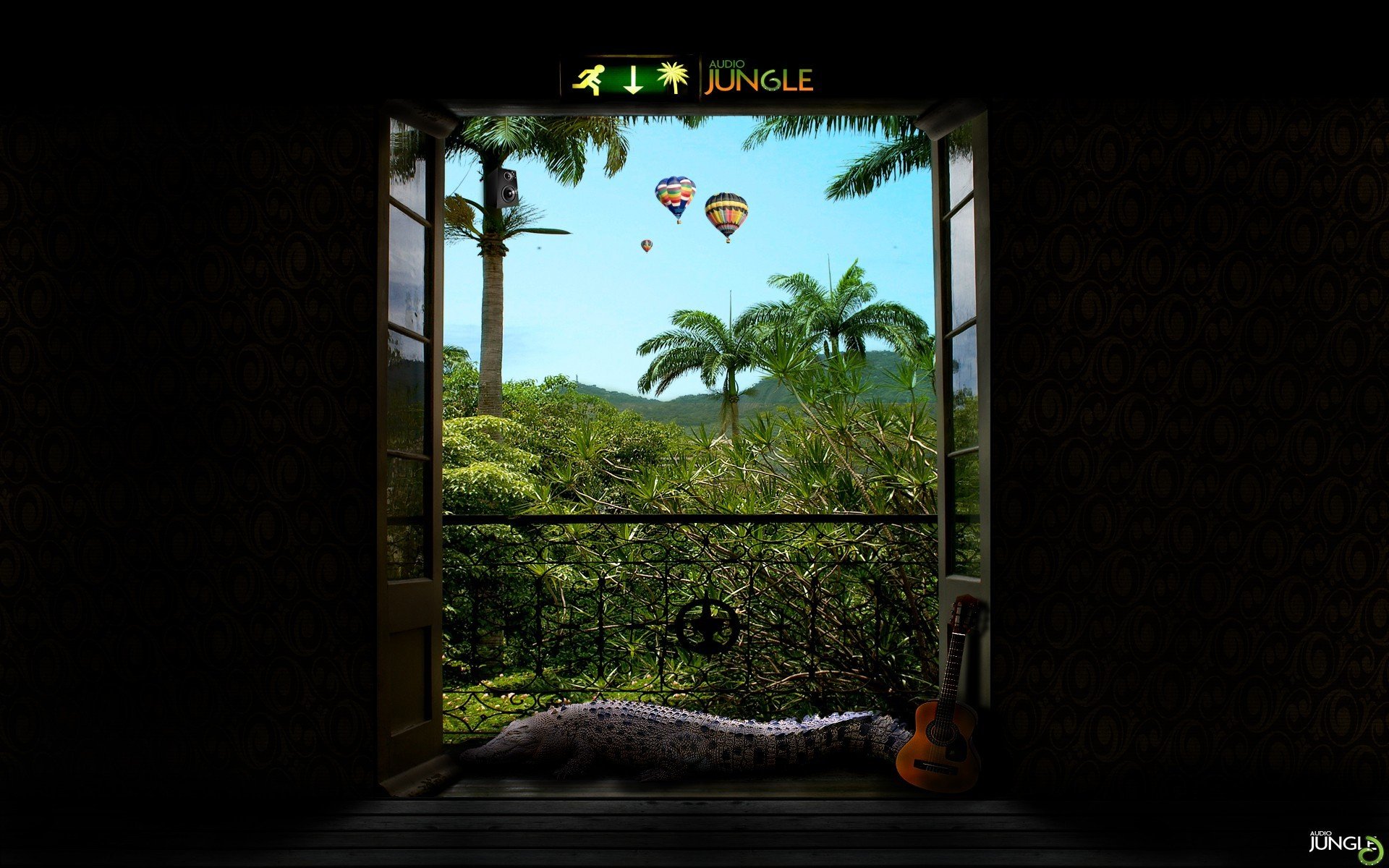 A lake with a waterfall and palm trees on the background of mountains and a bright rainbow across the sky