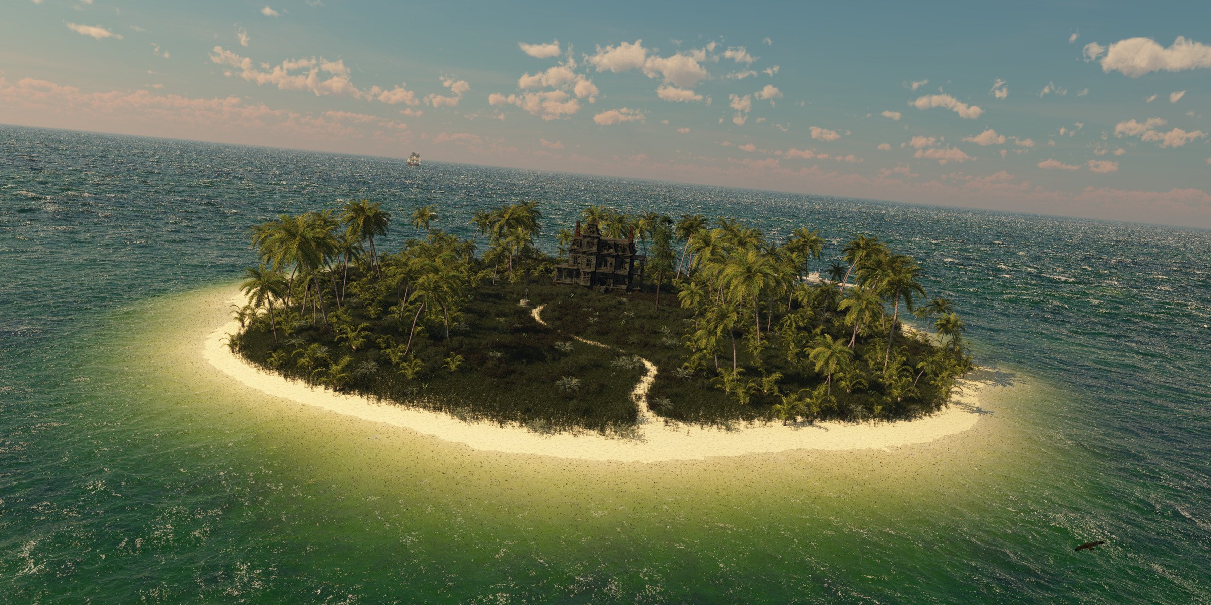 A paradise island with palm trees and white sand in the middle of the blue of the oxen and the sky