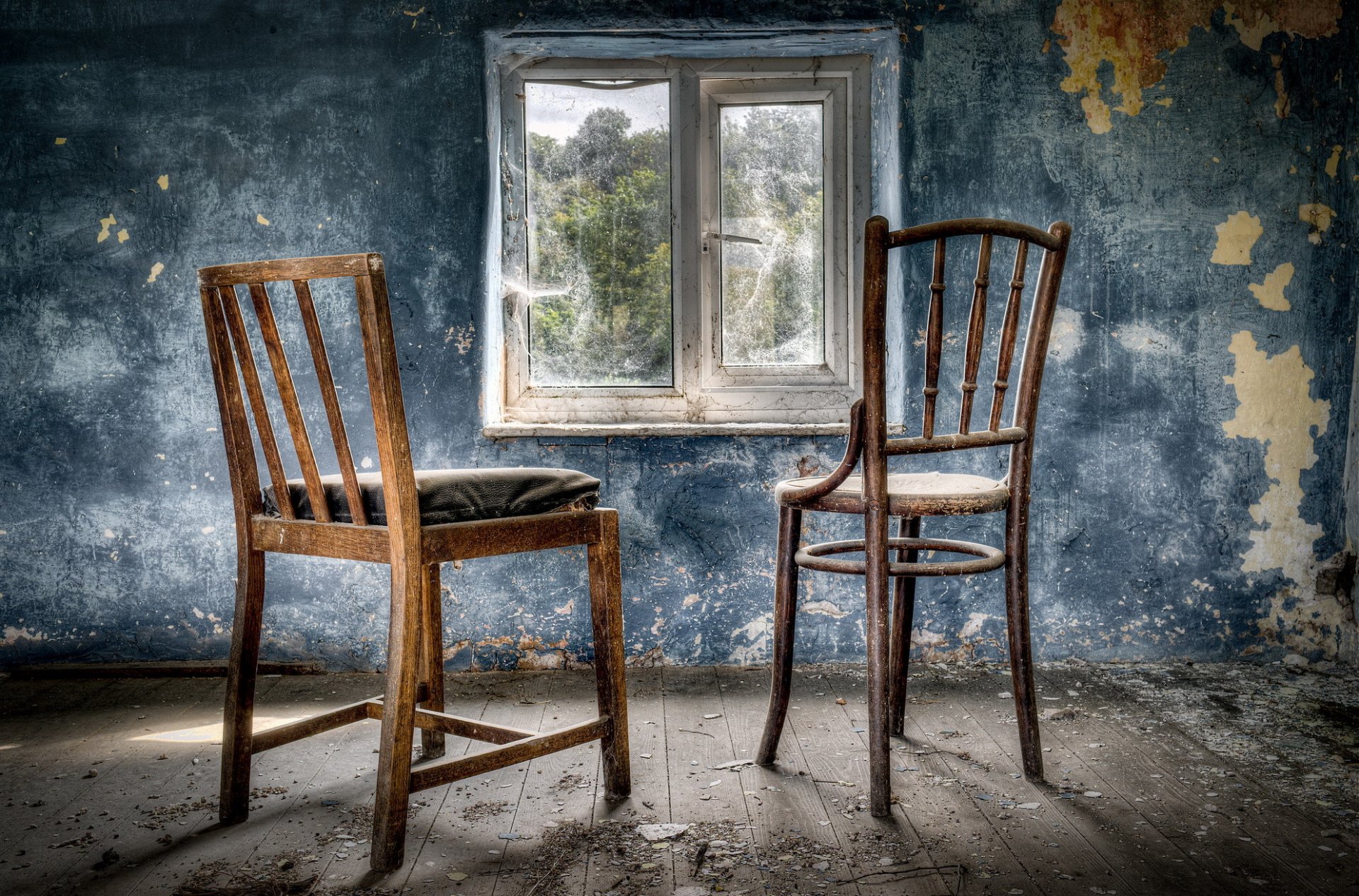 The interior of the room is in a minimalist style, with chairs, an armchair and a door