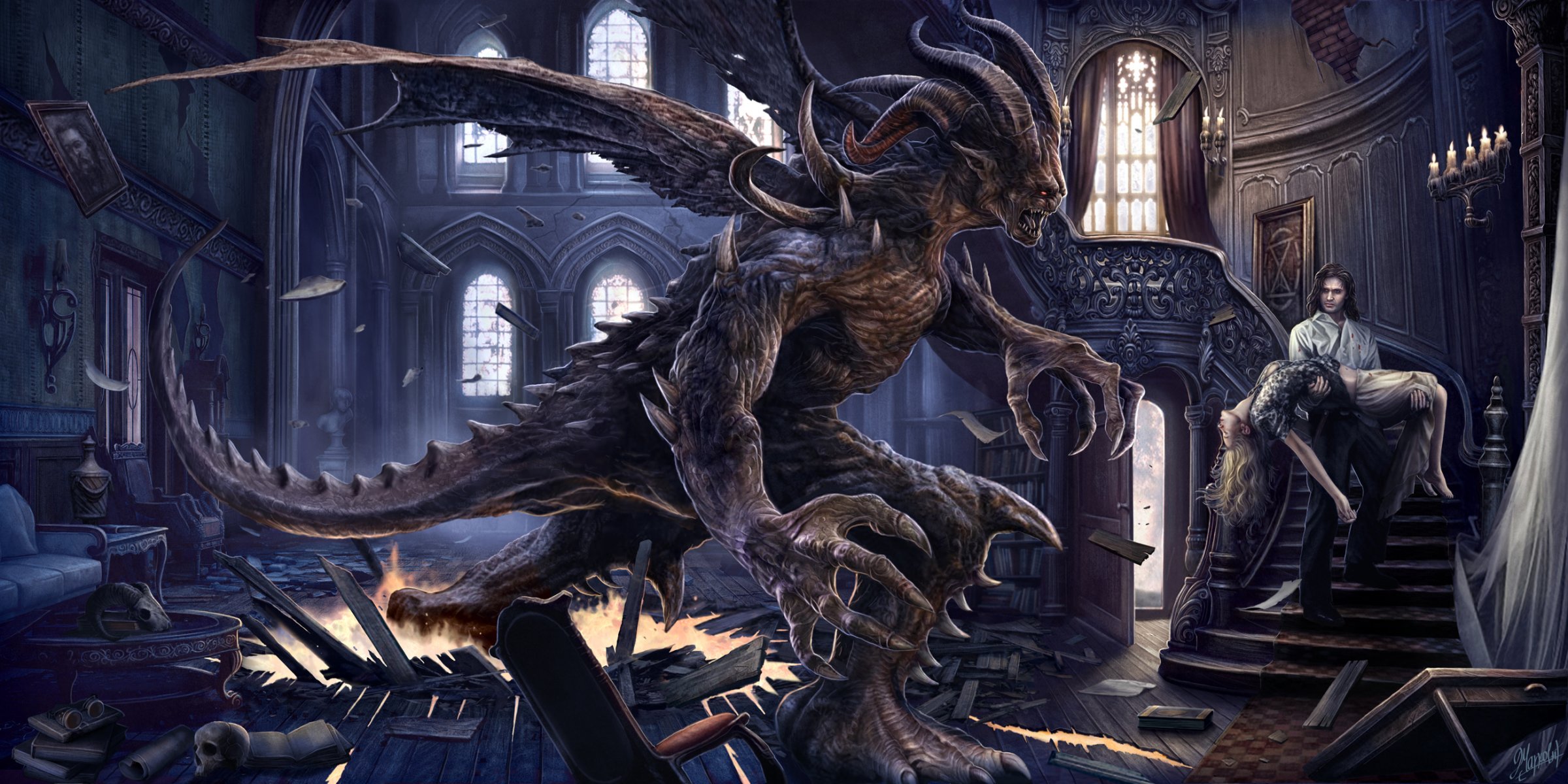 Fantastic demon with wings on the background of a castle from warcraftFantastic demon with wings on the background of a castle from warcraft
