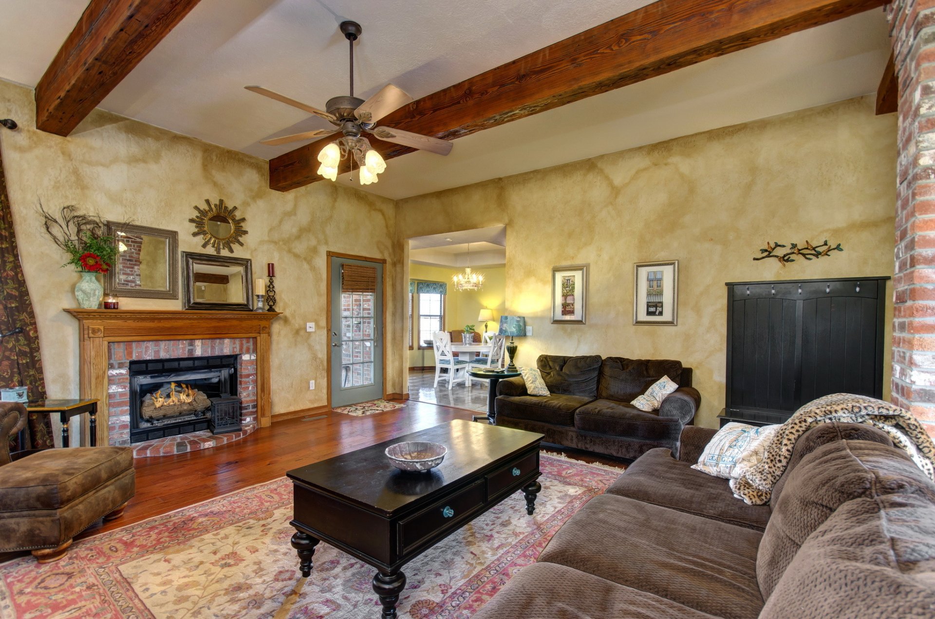 Interior design with fireplace and sofa