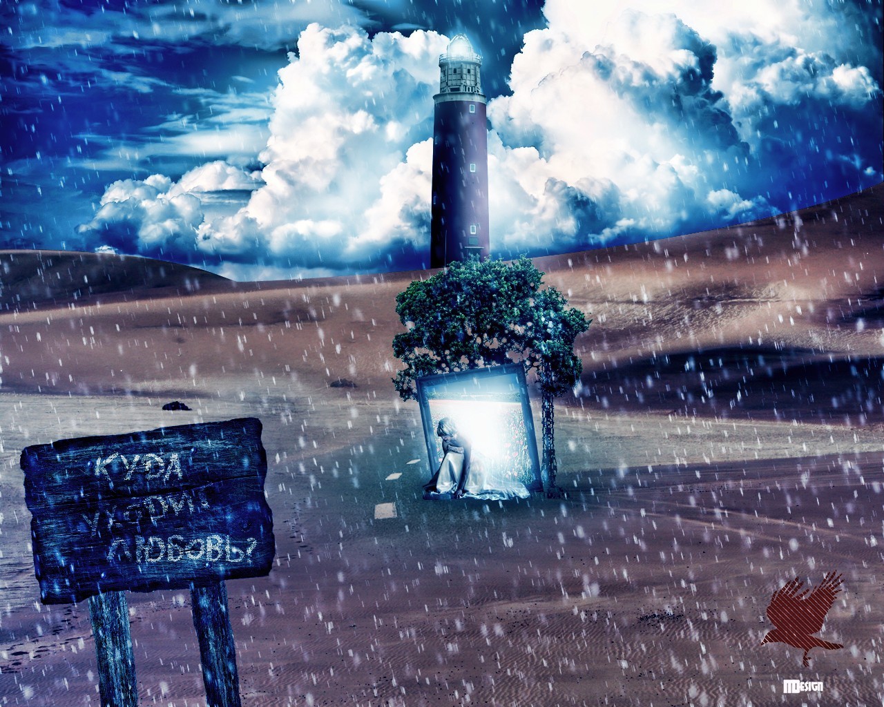 A girl sitting under a tree in the desert with a lighthouseA girl sitting under a tree in the desert with a lighthouse