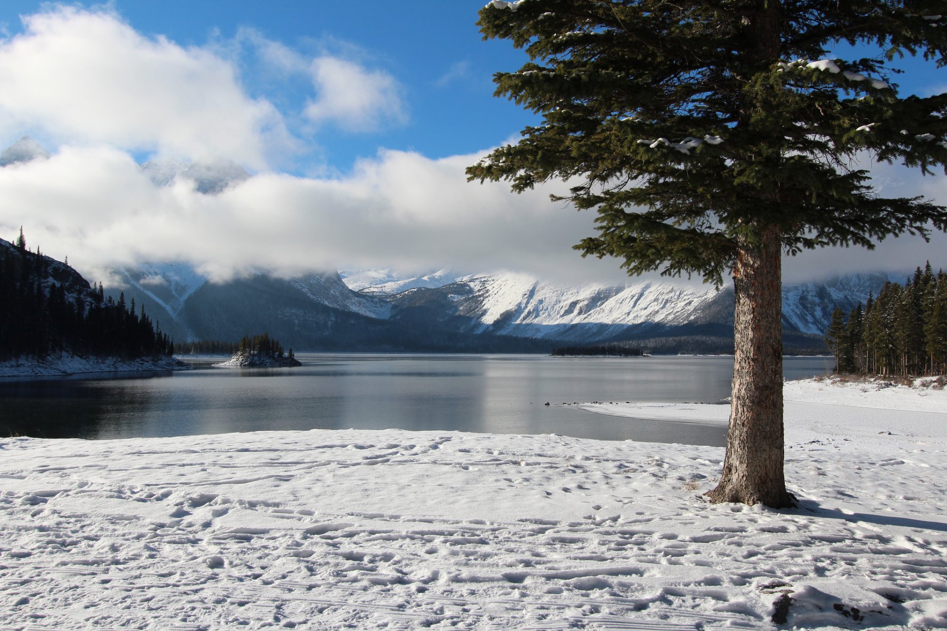 A gray block of rock on the shore, against the background of a lilac sky