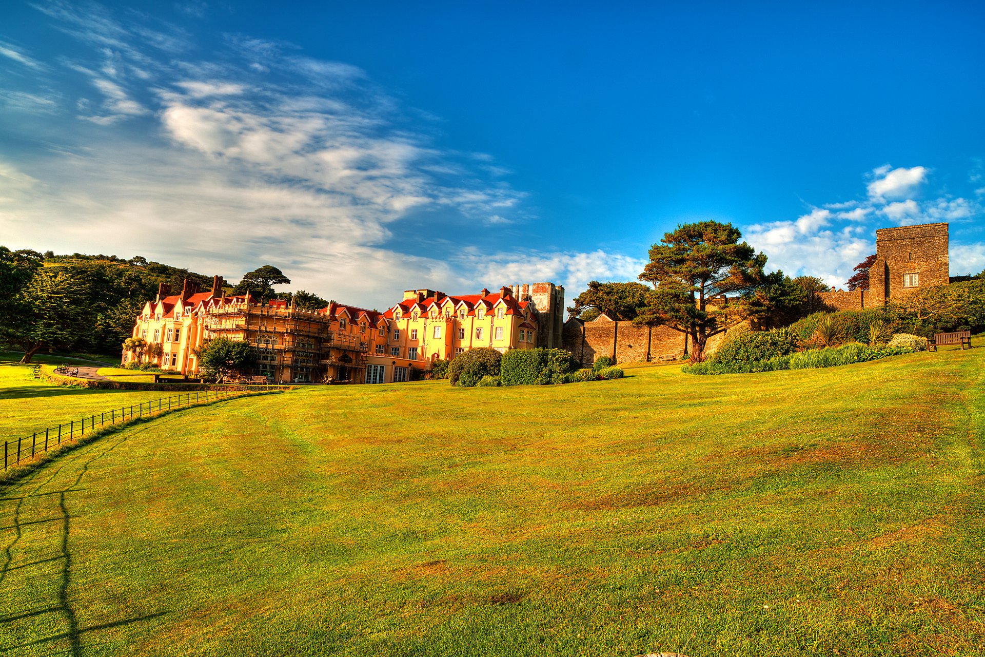 A green field covered with low grass with a view of the hillA green field covered with low grass with a view of the hill