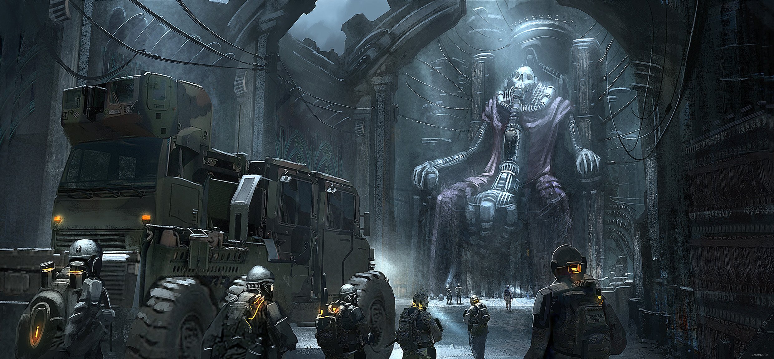 Fantastic creatures in outer space in armored suits. blue skulls glow in helmetsFantastic creatures in outer space in armored suits. Blue skulls glow in helmets