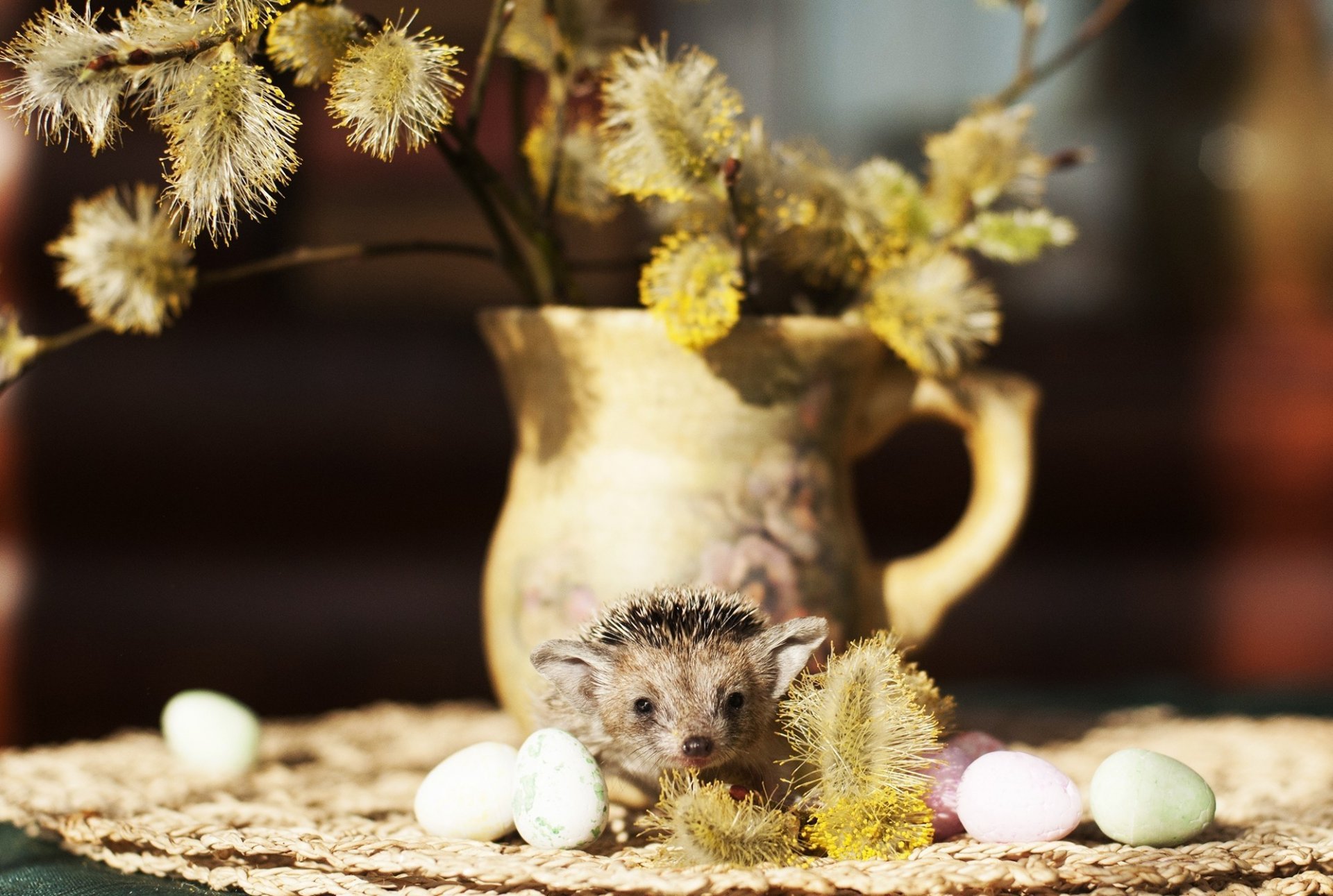 Hedgehog on the background of a vase with quail eggs