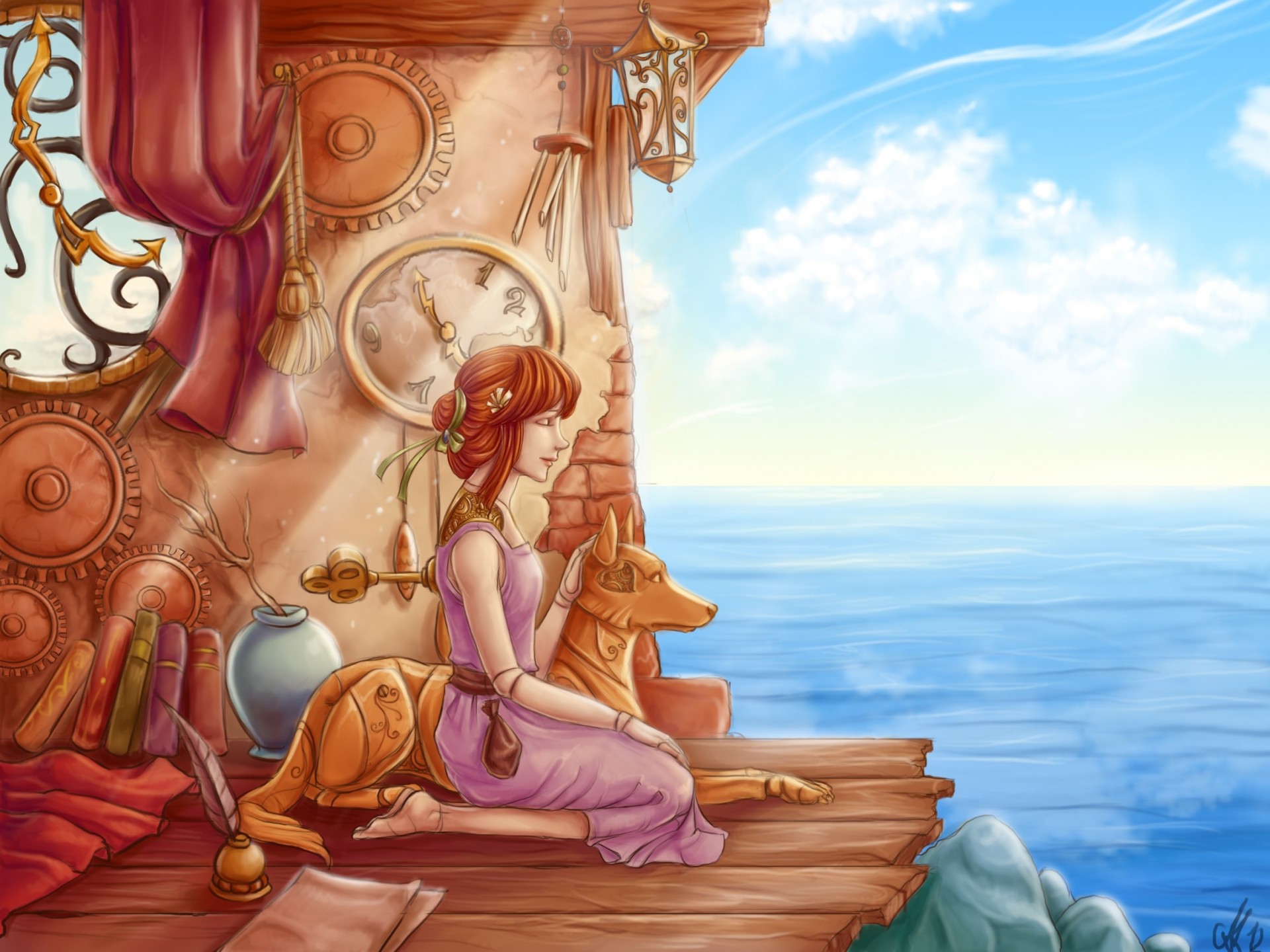 Fabulous art, sickles of the moon on the crowns of trees, a girl on a ladder to a tree, rises to one of themFabulous art, sickles of the moon on the crowns of trees, a girl on a ladder to a tree, rises to one of them