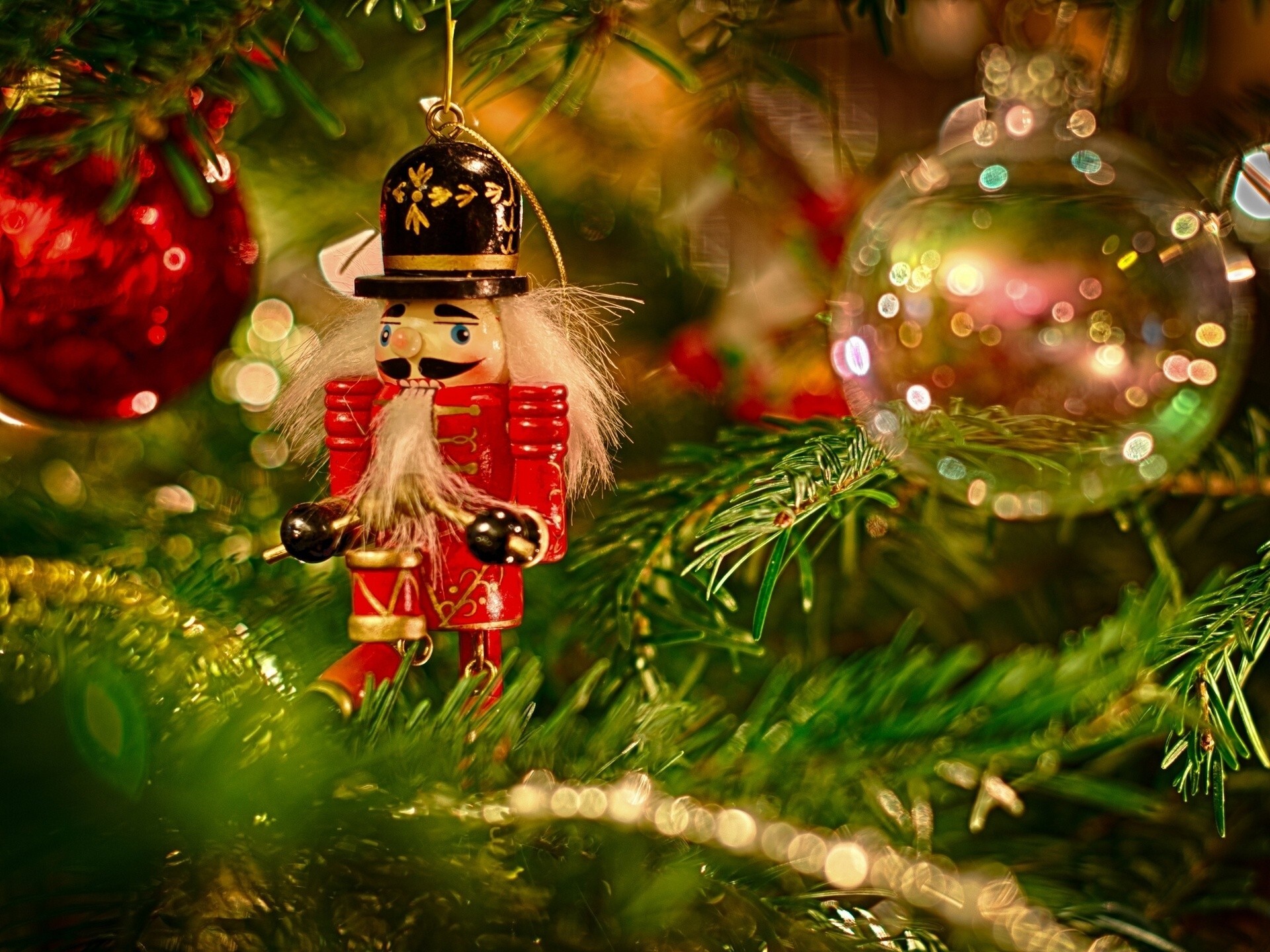 Christmas toys a nutcracker and a pair of balls on a Christmas tree branch