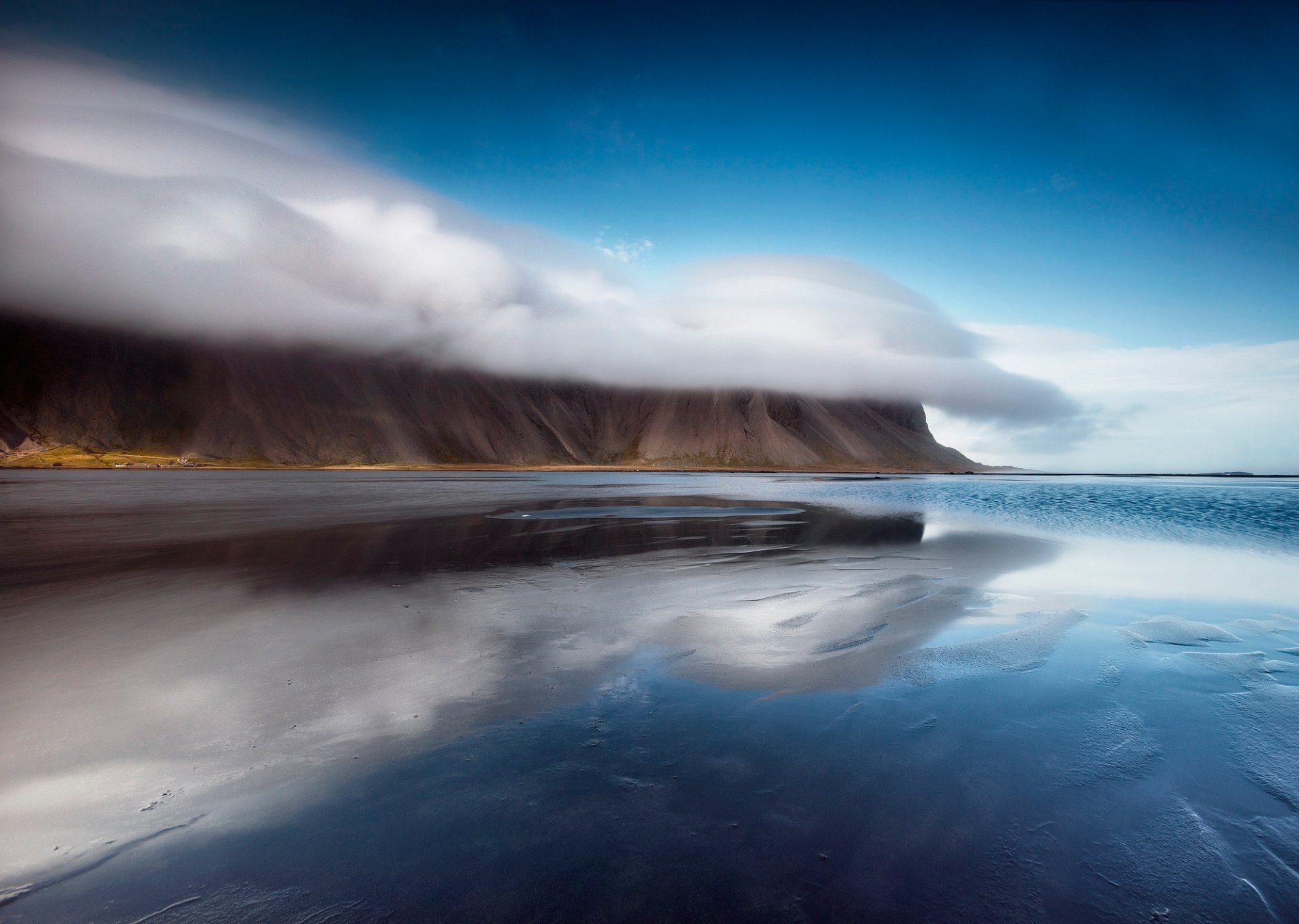 A light fog descended on the mountains and forest, reflecting the clouds in the lake
