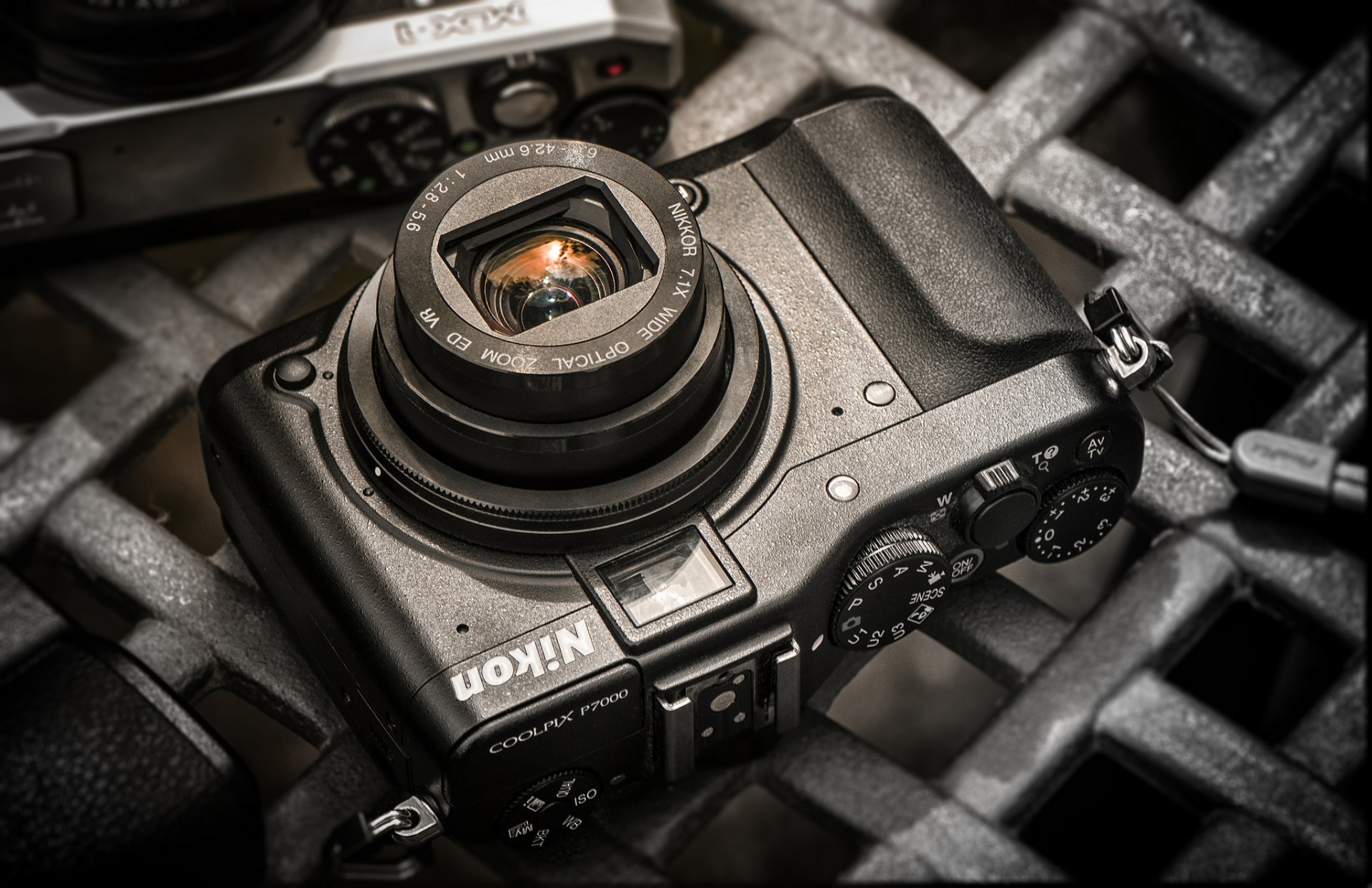 The camera is lying on the sewer grate