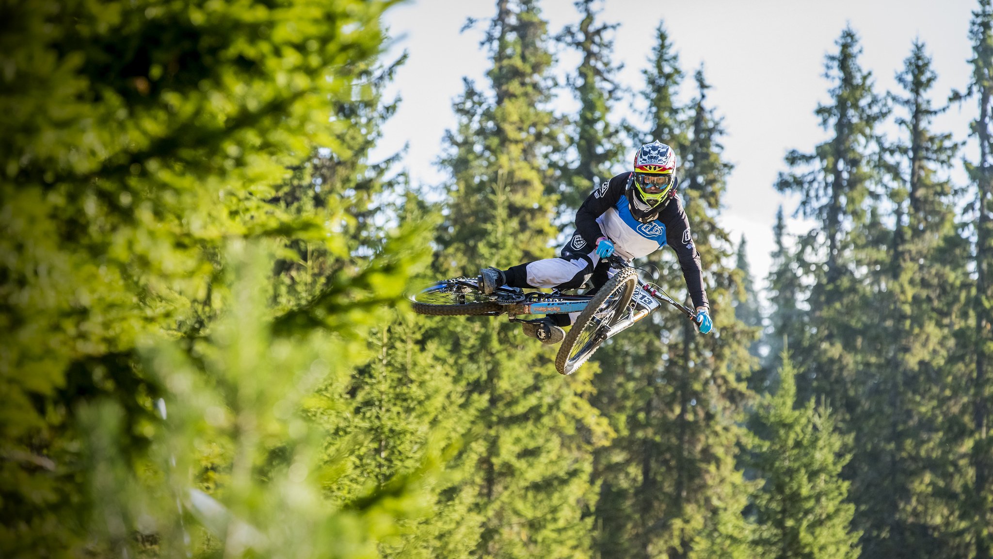 An athlete on a bicycle flies against the background of treesAn athlete on a bicycle flies against the background of trees