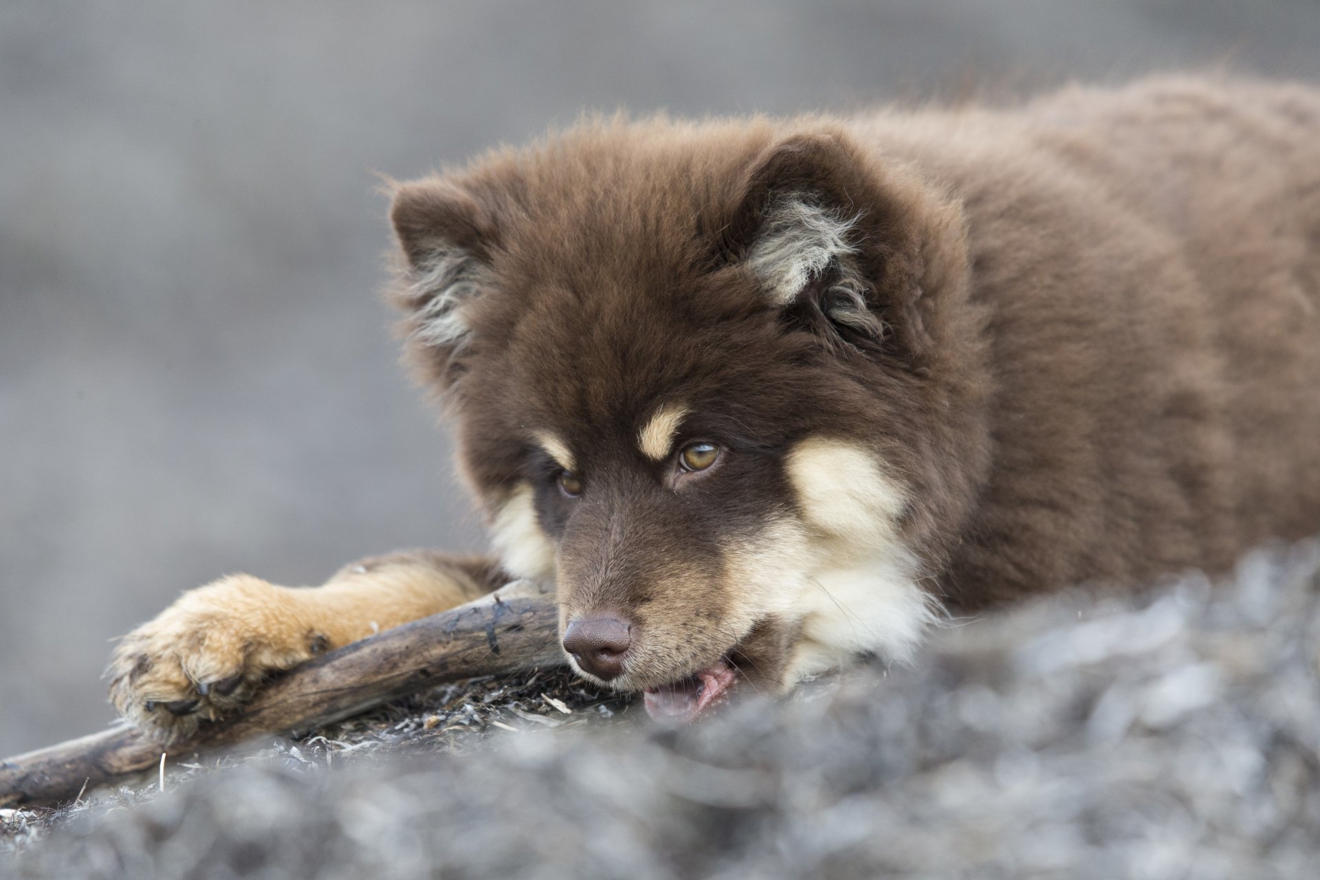 Funny dog licks his lips while sitting on the grassFunny dog licks his lips while sitting on the grass