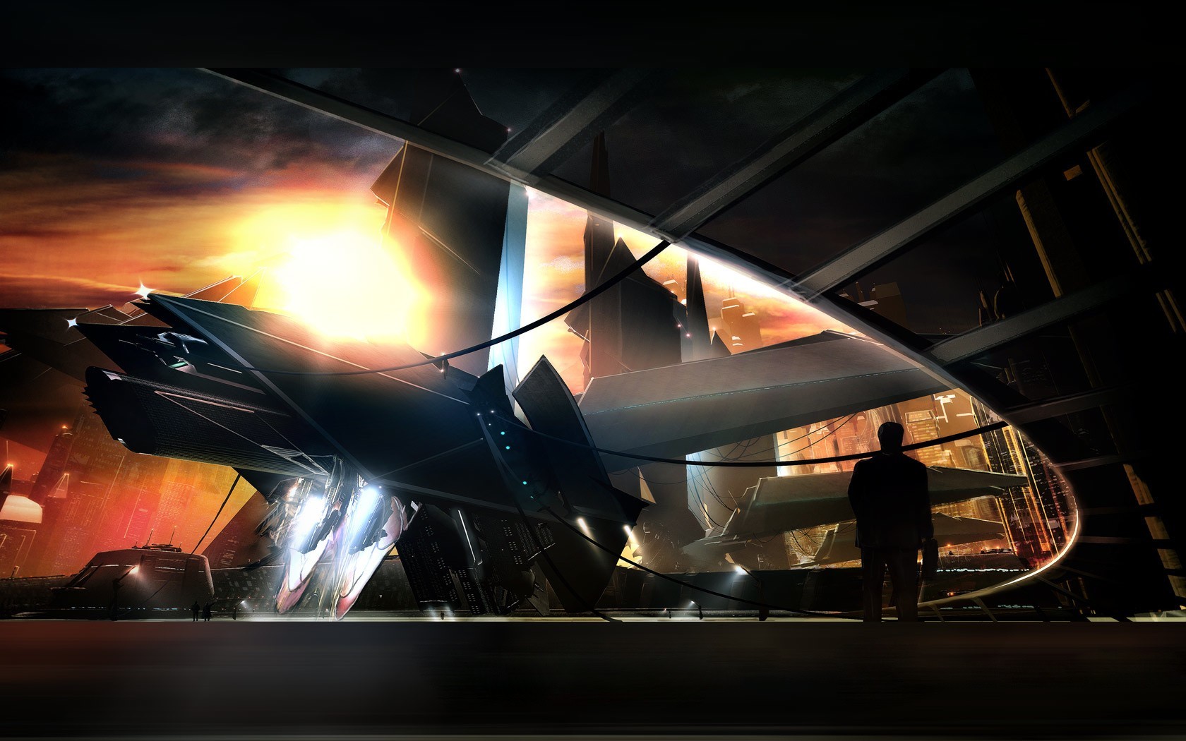 The city of the future with a flying ship in the art styleThe city of the future with a flying ship in the art style
