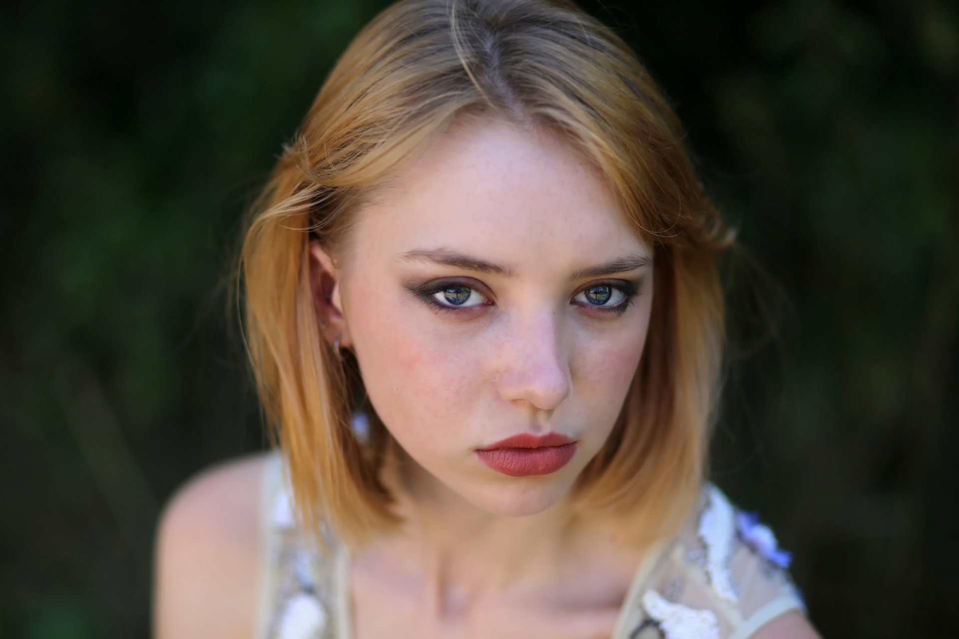 A girl with blonde hair has a close-up face burying a virgin