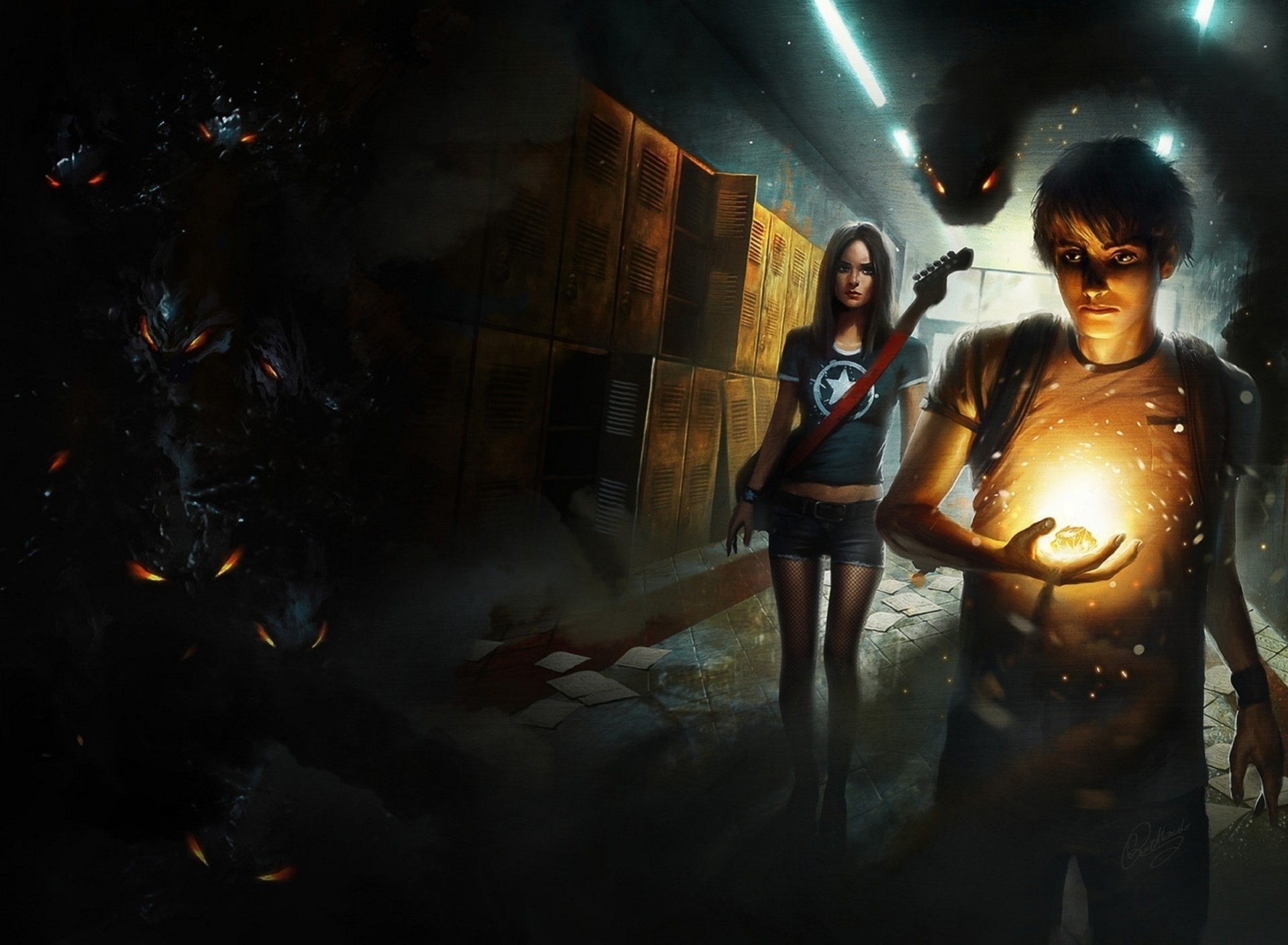 A guy with a glowing stone, and a girl with a guitarA guy with a glowing stone, and a girl with a guitar