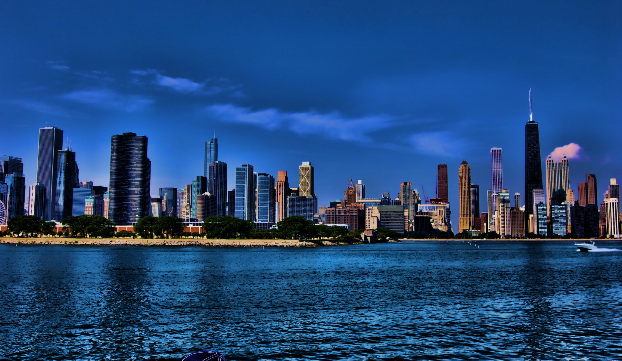 Chicago skyscrapers in evening elimination on the riverbankChicago skyscrapers in evening elimination on the riverbank