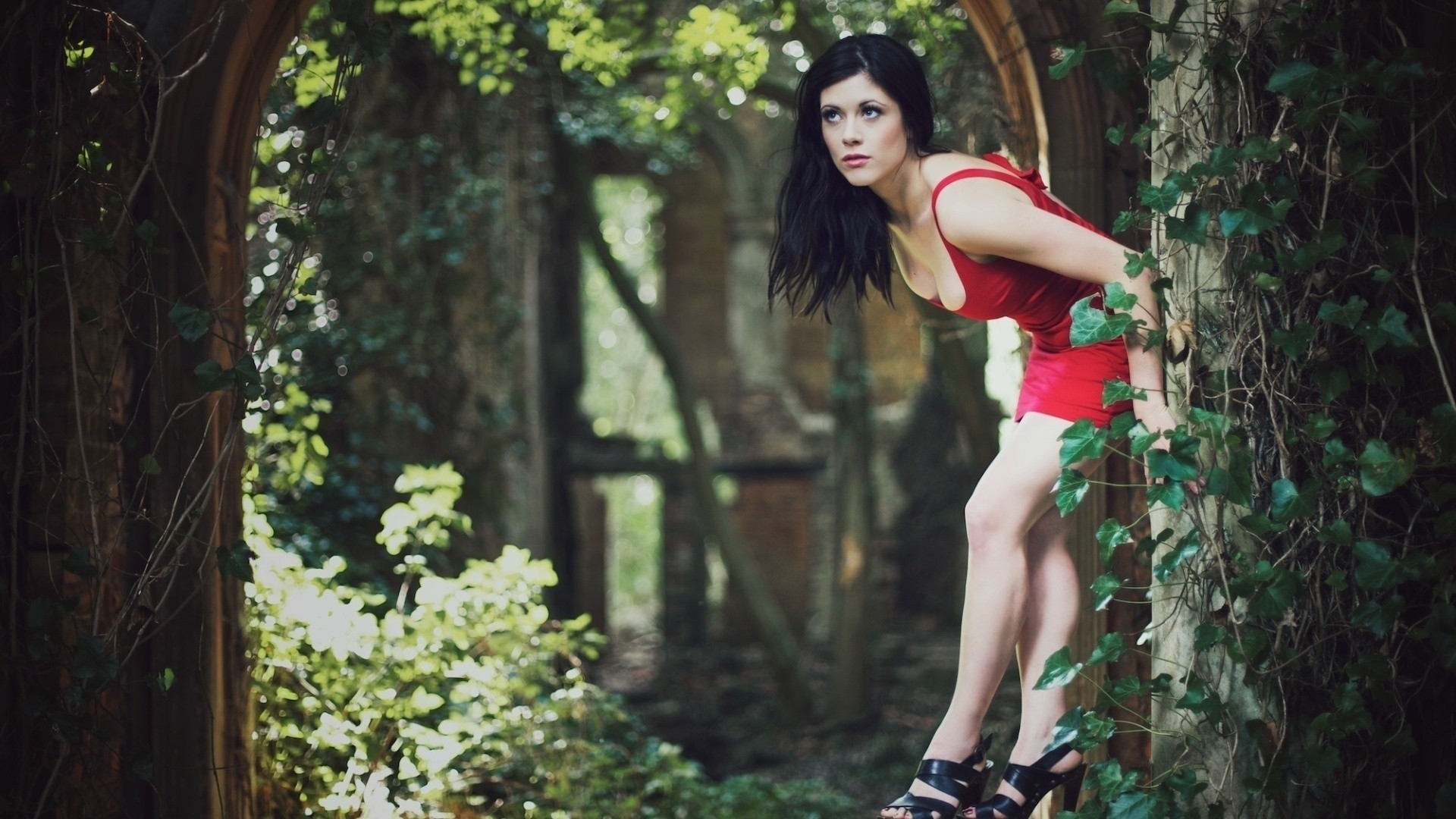 Brunette in a red dress on the background of natureBrunette in a red dress on the background of nature